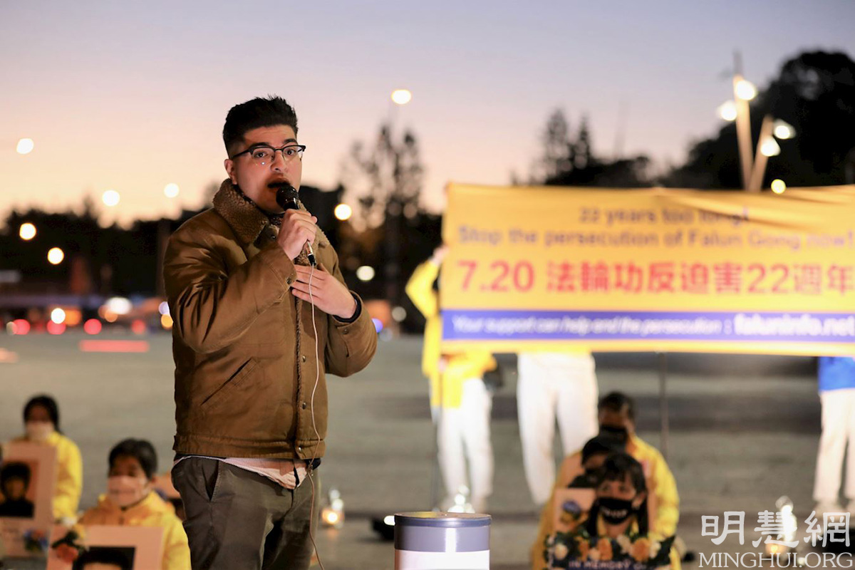 '图5:德鲁·帕夫洛在烛光悼念活动上发言中说:“看到法轮功学员坚持不懈的反迫害,令我感动,我将永远与你们站在一起。”'
