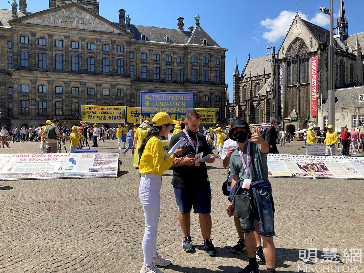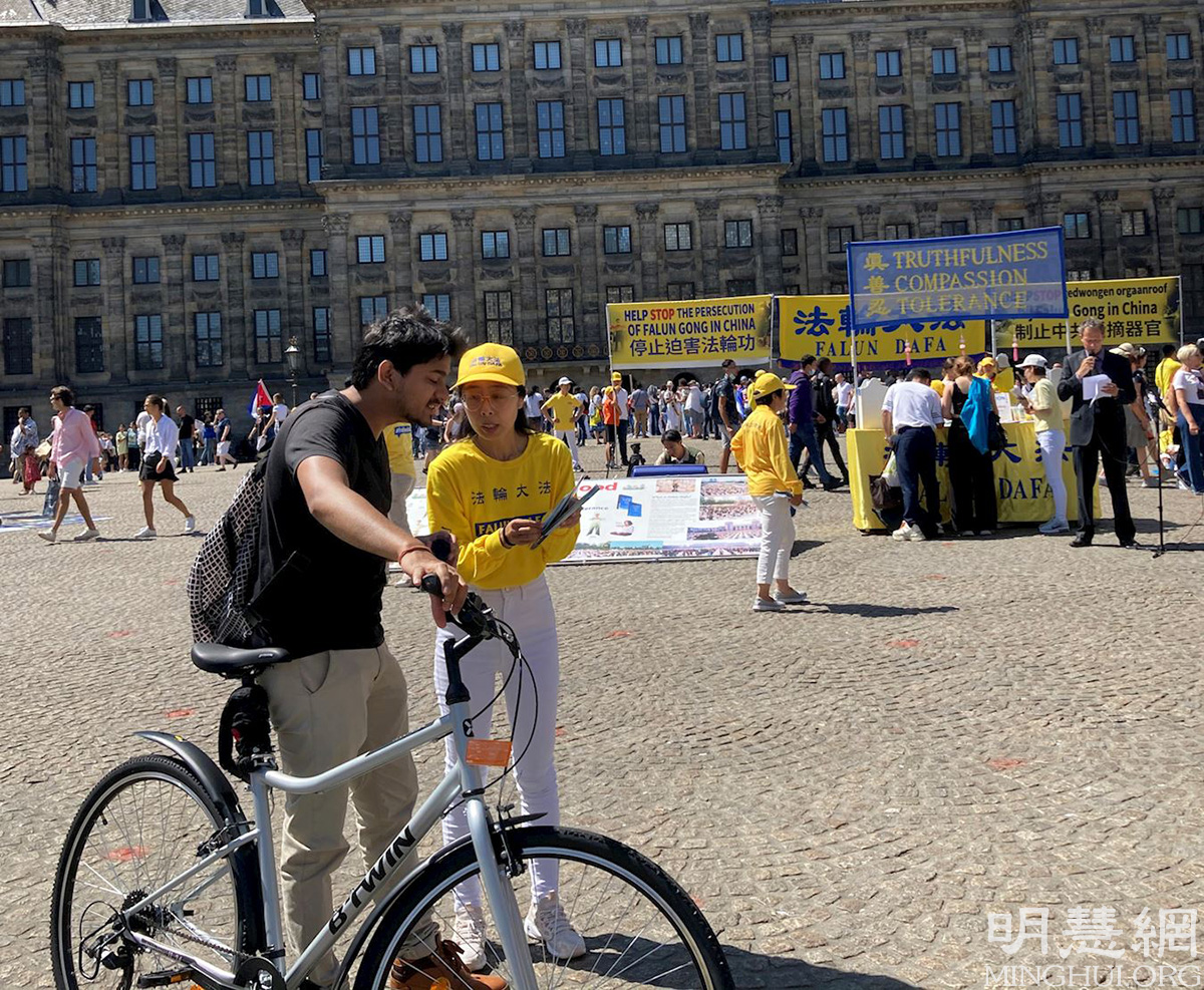 一位华人林先生告诉法轮功学员,他在荷兰已经生活两年多了。他说:“因为我不喜欢中国才来到这里。我在国内上大学的时候就天天通过动态网翻墙,了解了很多真相。我还通过动态网早早做了三退。我从高中的时候就不唱国歌了,知道那都是假的。我还知道天安门自焚也是假的,中共经常撒谎造假。他们能做出活摘器官这种事,说明中共很残忍。