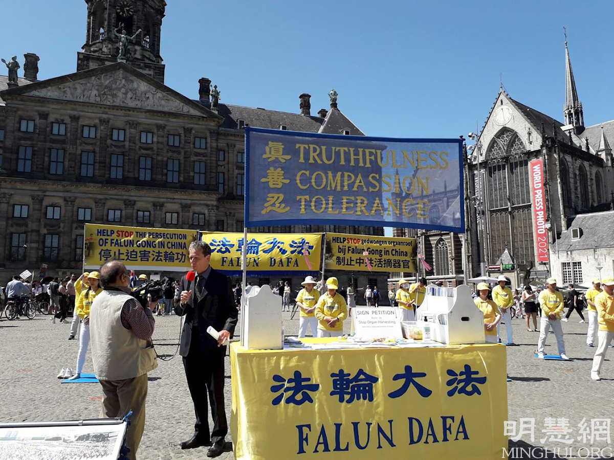 七月十七日,部份荷兰法轮功学员来到荷兰首都阿姆斯特丹市中心——达姆(Dam)广场举办反迫害活动。