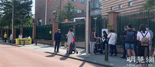 七月二十日上午,几十名法轮功学员又来到位于海牙的中共驻荷兰大使馆前举行抗议活动,呼吁中共立即停止迫害法轮功,并喊话中使馆工作人员,唾弃中共,为自己选择美好而光明的未来。