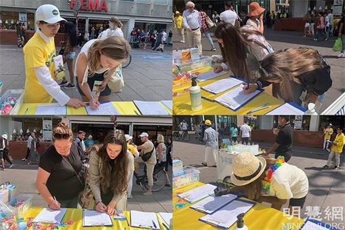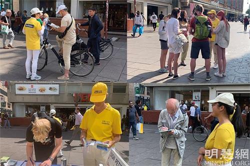 7月20日下午,法轮功学员又来到海牙最热闹的商业中心,传递法轮功真相,揭露中共活摘法轮功学员人体器官的罪恶,并征集签名,得到许多民众的支持。