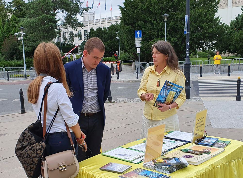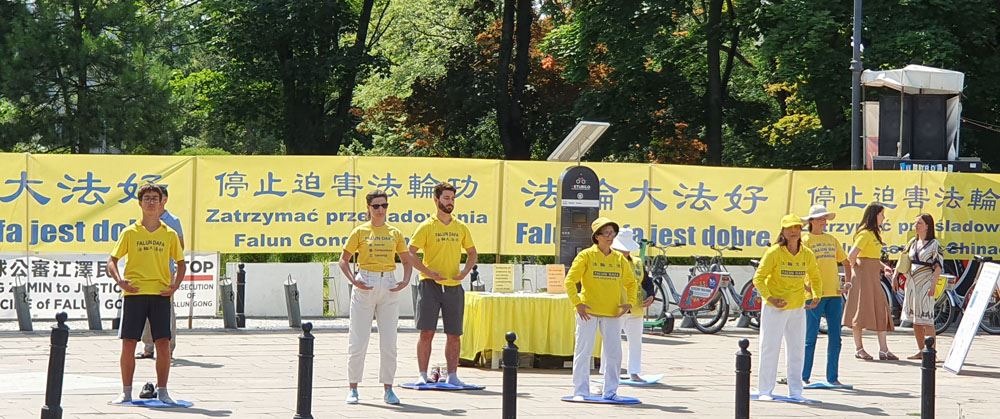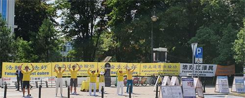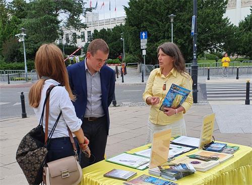 在议会大楼的对面,悬挂着醒目的“法轮大法好”、“停止迫害法轮功”、“法办江泽民”、“共产主义的终极目的是毁灭人类”及“提高道德是人类唯一出路”等条幅,长长的街边摆着中波英三种文字法轮功真相展板,在慈悲祥和的《普度》、《济世》音乐中,法轮功学员发放传单和波语《九评共产党》,为过往行人及议员们讲真相。多位议员、记者及市民在“制止迫害,解体中共”的征签簿上签名,也有很多人对法轮功学员展示的优美舒缓的法轮功功法感兴趣,非常高兴的拿取资料。