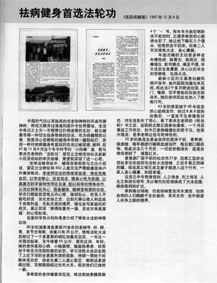-1997年12月4日,《医药保健报》以《祛病健身首选法轮功》作了报导,文章列举了7位法轮功学员的姓名、病情及改善情况。
