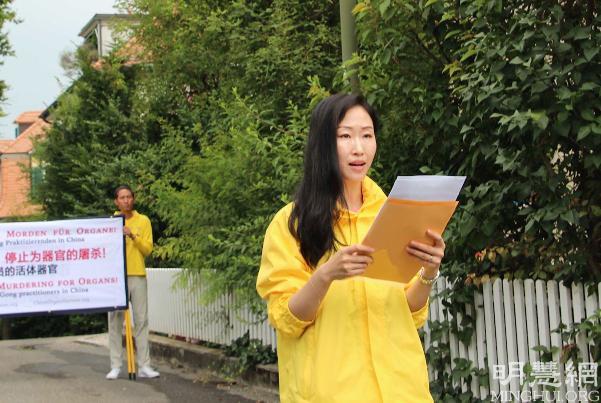 上午法轮功学员代表来到中共驻伯尔尼使馆前宣读劝善信,要求停止迫害法轮功;同时提醒领馆官员中共所犯下的种种罪行及给民众带来的痛苦,规劝他们早日退出中共及其组织,有个美好的未来。