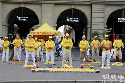 下午,学员们在控豪斯(Kornhaus)广场上演示功法,随着音乐缓慢圆的炼功场面让很多人停下了脚步,有的饶有兴致地看着学员的功法演示,有的还跟着学员比划炼功动作。