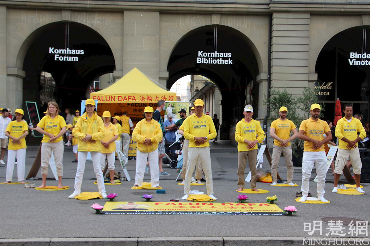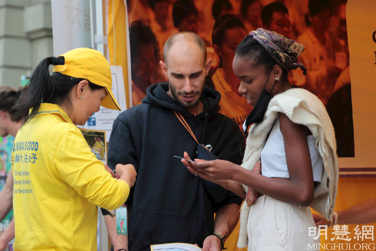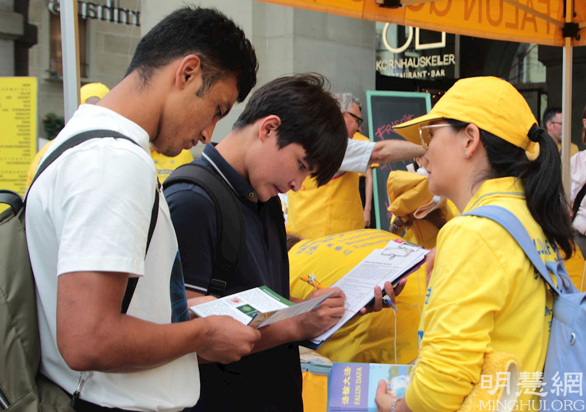 活动中,学员并宣读了多位瑞士议员的支持信。不少路人停下脚步,聆听学员们的演讲。很多人知道了法轮大法是教人按照真、善、忍做个好人,也了解到中共为什么要迫害法轮功。