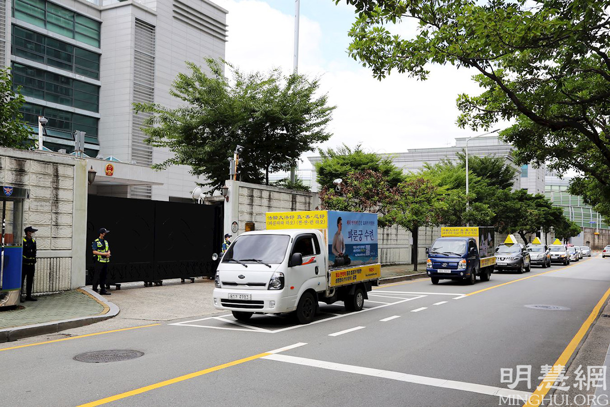 ![]() 图2:釜山法轮功学员的游行车队行经中国总领事馆。 |