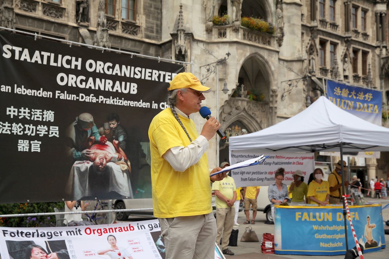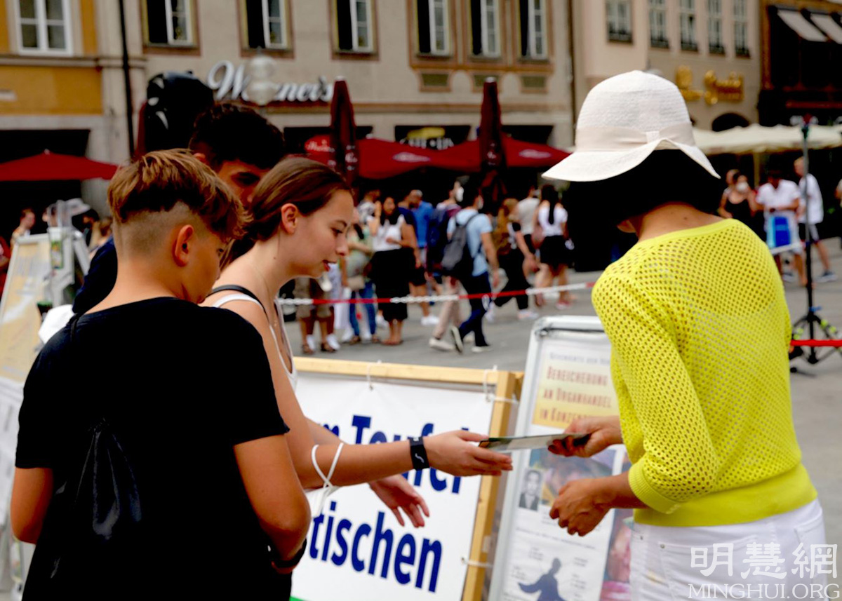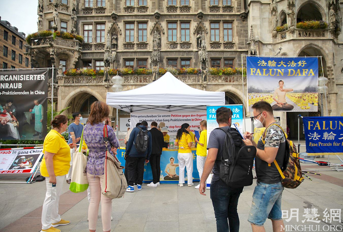 当天,市中心玛琳广场(Marienplatz)恢复了中共病毒(武汉肺炎)爆发前的繁荣,来往行人很多。不少人驻足观看法轮功学员演示功法,“法轮大法洪传世界”、“中共活摘法轮功学员器官”等展板与横幅也吸引了人们的目光。学员们现场还宣读了议员来信,很多民众慢下脚步,与法轮功学员进行交谈。很多人都签名声援法轮功学员反迫害。