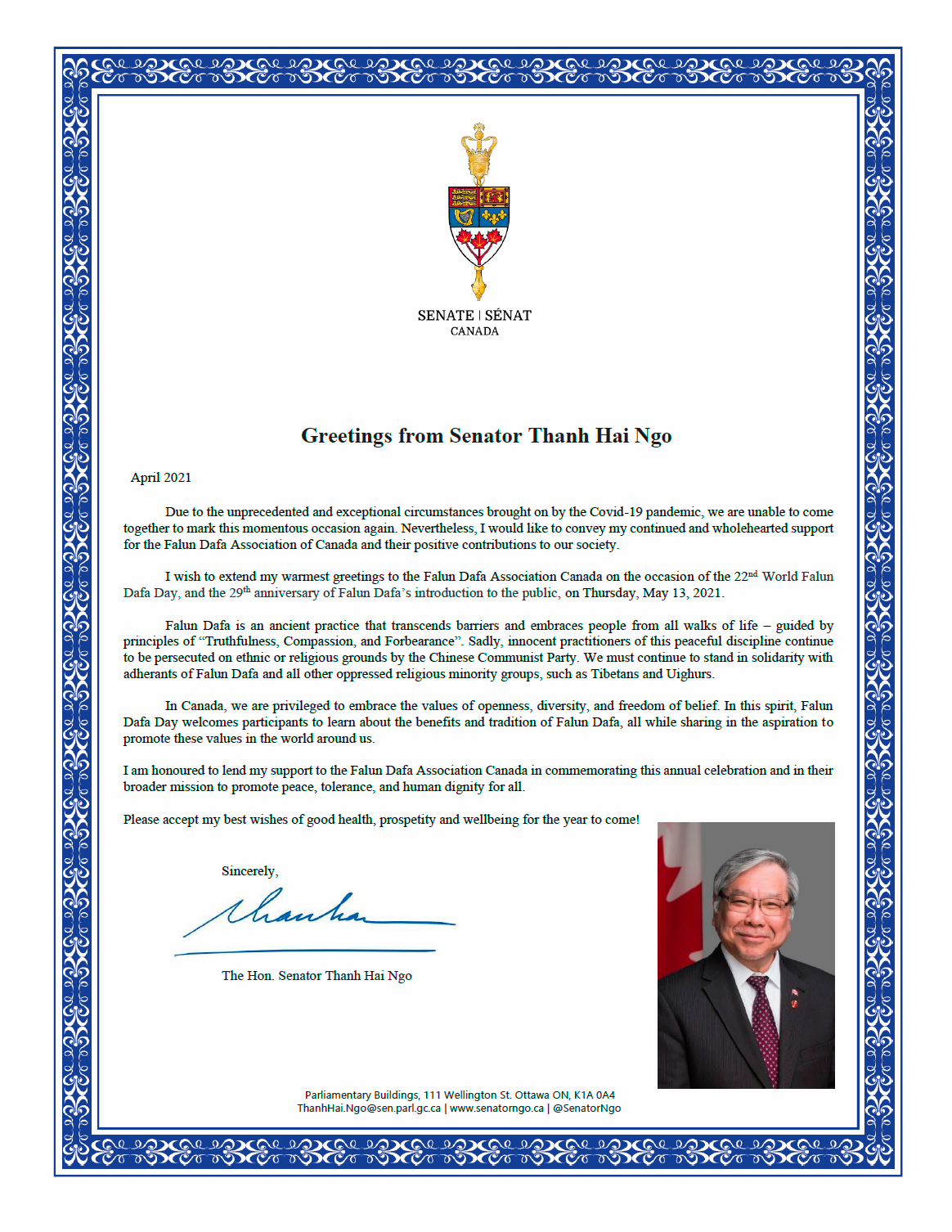 联邦参议员吴蓝海(Thanh Hai Ngo)在贺信中写道,秉承真善忍的理念,法轮大法这个古老的修炼功法,冲破重重阻力和障碍,让不同阶层的民众受益。但这个和平功法的无辜修炼者,却持续遭受到中国共产党的信仰迫害,“我们必须坚定的支持法轮大法的追寻者,以及其他被迫害的信仰少数族群。”