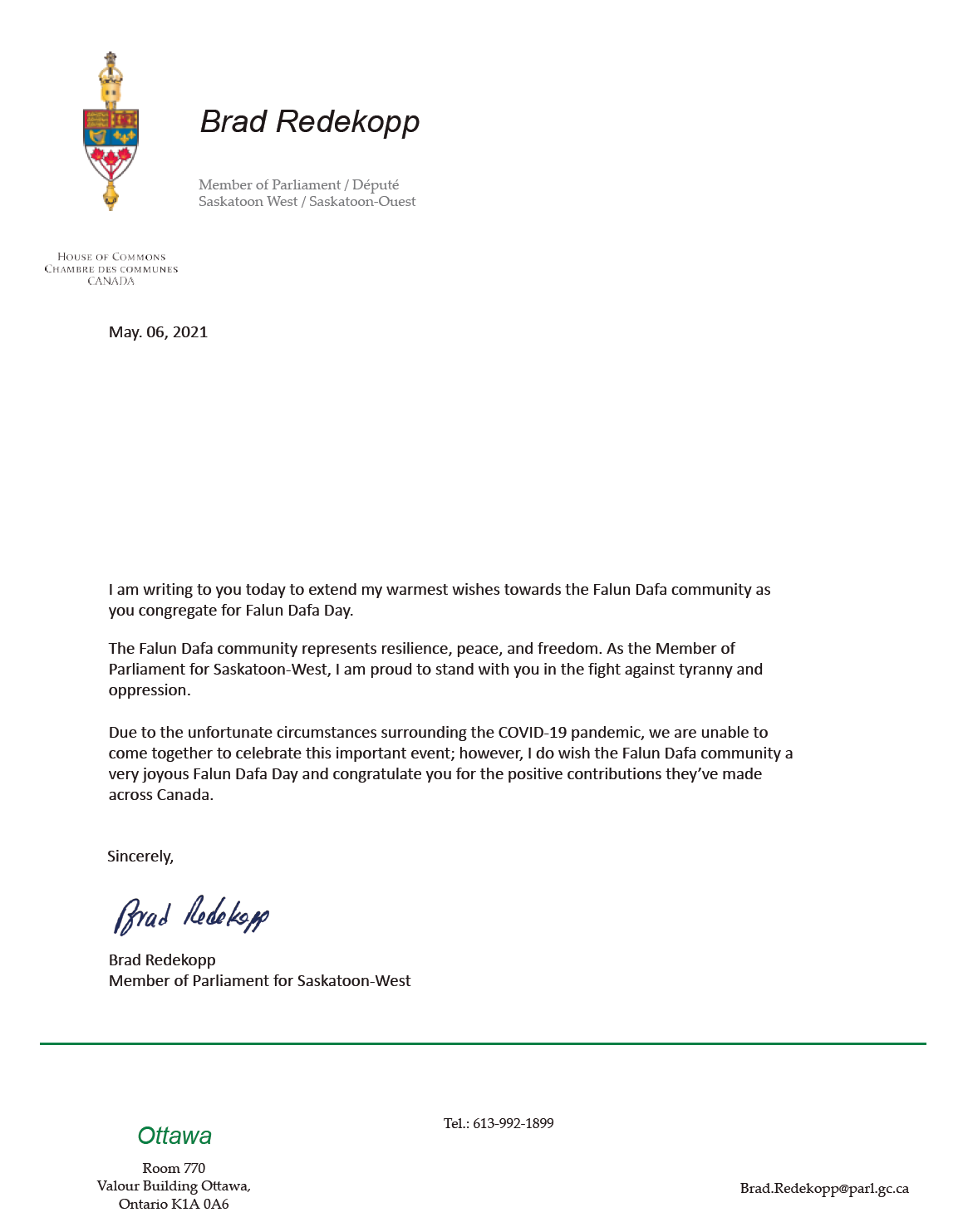 萨迪卡通地区国会议员布拉德·雷德科普(Brad Redekopp)在贺信中写道:“法轮大法团体代表着不屈不挠、平和自由。作为西萨斯卡通的国会议员,我非常荣幸能与你们站在一起,共同对抗暴政和迫害!”