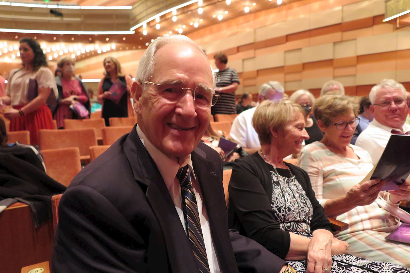 ![]() 图4:二零二一年八月七日下午,前杨百翰大学教育心理学教授加里·克雷默(Gary Kramer)在乔治·多洛雷斯多尔·埃克尔斯剧院观赏神韵。 |