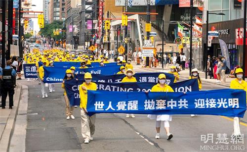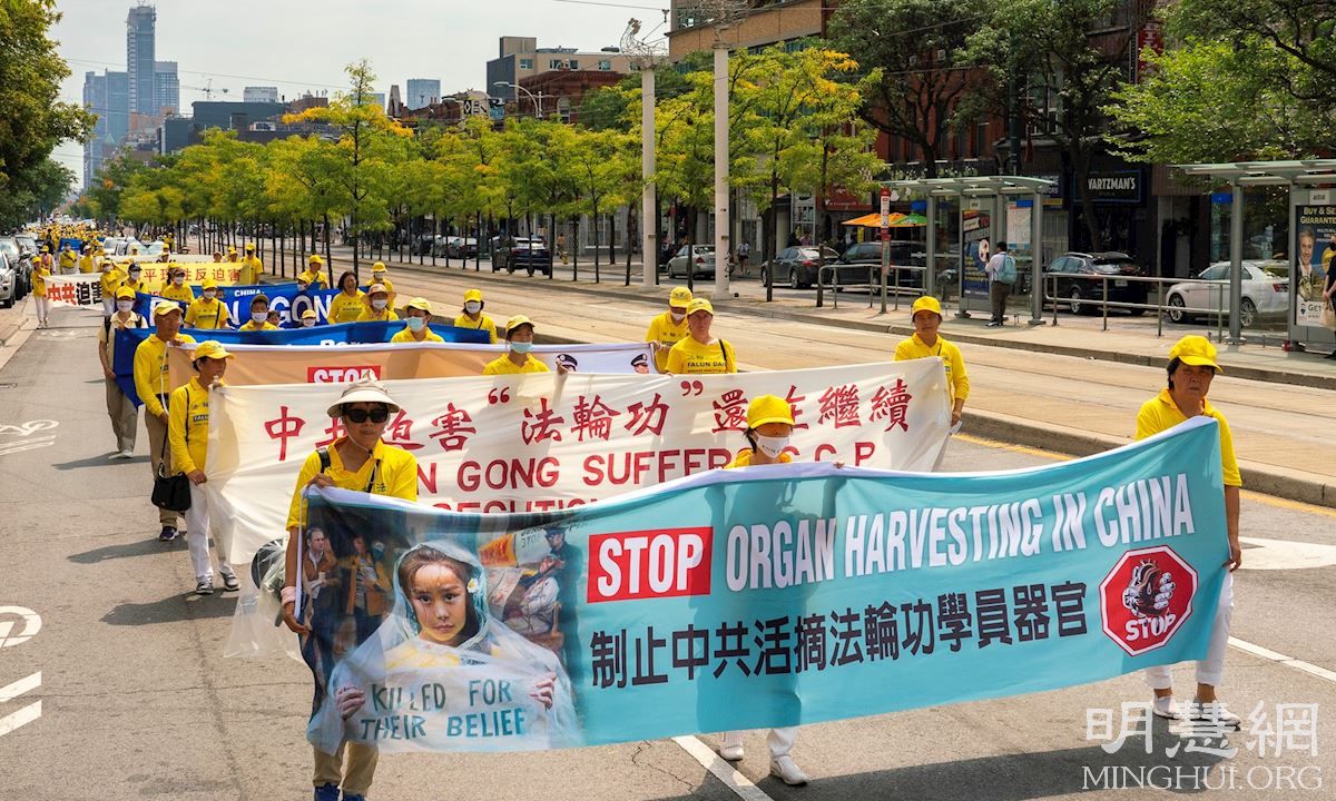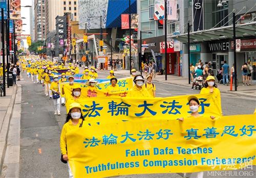 游行队伍从安大略省府大楼前的皇后公园(Queens Park)出发,由天国乐团打头阵,经市中心和唐人街,历时近两个小时。沿途吸引了很多观众录像和拍照;有司机鸣笛表示支持,有民众签名支持反迫害,还有人咨询哪里可以找到炼功点。一位司机把手伸出车窗外,竖起大拇指沿着游行队伍从头到尾欢呼着:“Falun Dafa is good!(法轮大法好!)”