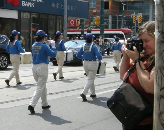 多伦多市中心一家高级西餐馆的经理珊姆(Sam)被天国乐团威武雄壮的乐声吸引,她用手机把整个游行队伍都录下来,她一边录一边跟队伍里的人挥手互动:Very Good!Excellent!Thank you!(非常好!非常棒!谢谢!)