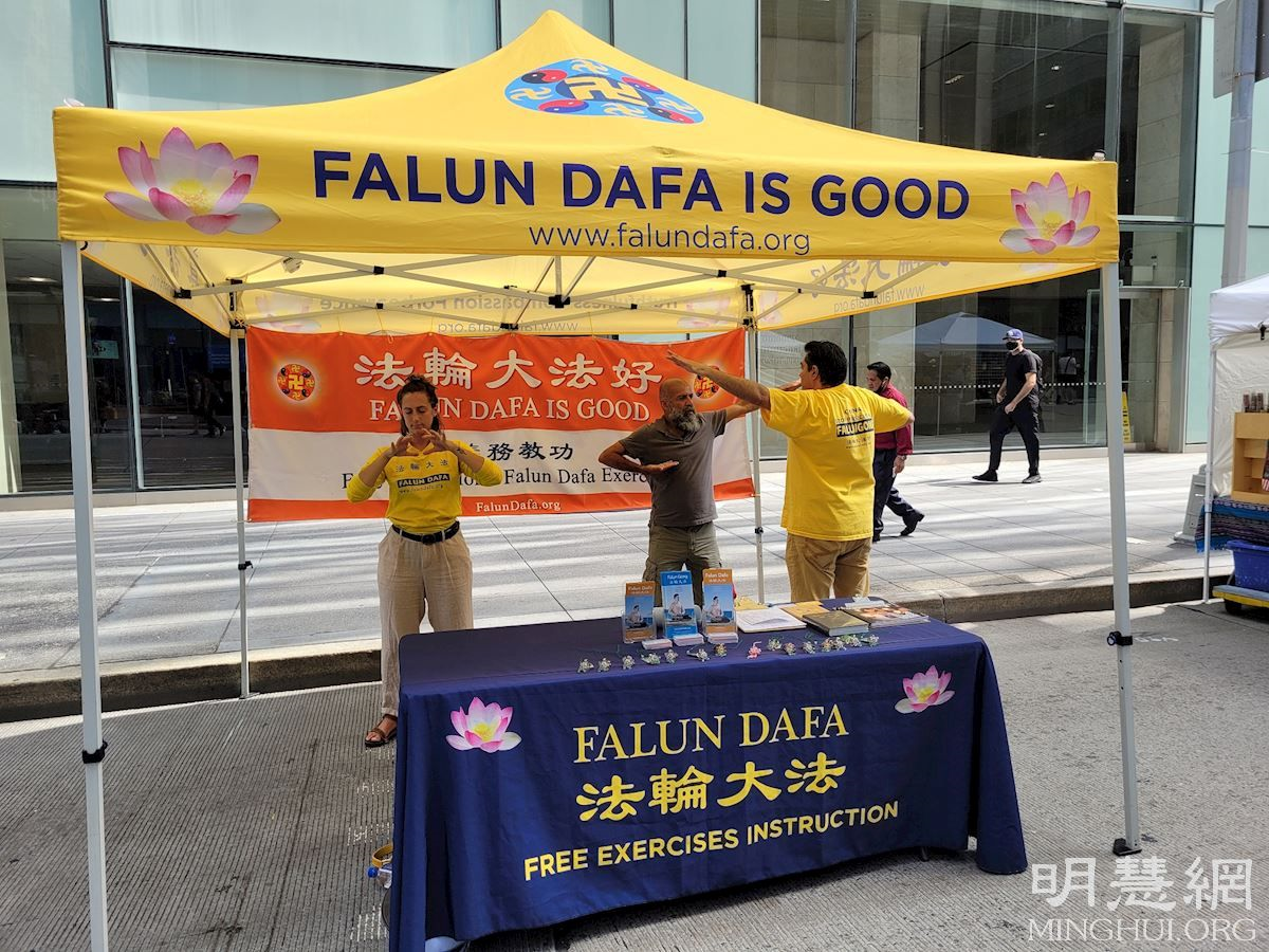 【明慧网二零二一年八月二十七日】二零二一年八月十四日和二十一日,纽约曼哈顿的第六大道和第八大道上各自举办了一天的集市。集市中,当地法轮功学员们摆设了真相展位向民众介绍法轮大法的美好。两天中,有许多人当场学炼法轮功,体验功法的玄妙,还有人当场买书,并留下联系电话,希望回家后还能继续修炼。