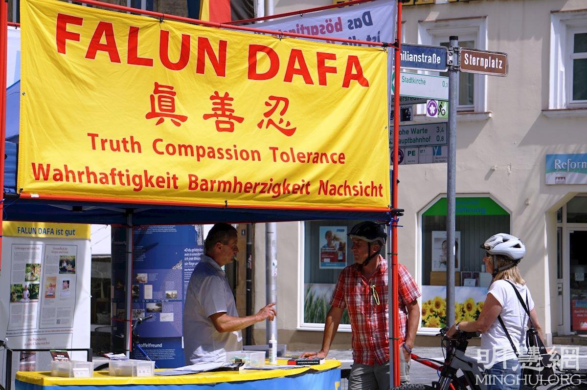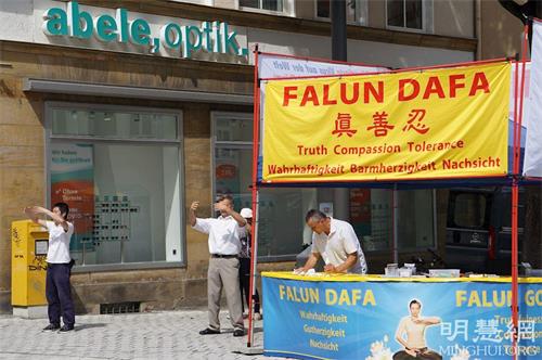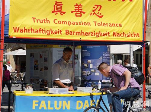 当天,这个弗兰肯地区部份学员举办的法轮大法信息日活动,为瓦格纳歌剧迷带来了意外的收获。在悦耳的炼功音乐中,人们可以看到学员们展示五套功法,桌子上有各个语种的法轮功真相传单,气氛祥和美好。不少人被吸引,驻足聆听学员介绍功法和发生在中国的迫害详情。有些人在呼吁德国政府帮助制止中共活摘器官的请愿书上签字;有的市民主动拿取空白征签表,在家人和朋友圈里征签;还有的表示希望学炼法轮功。