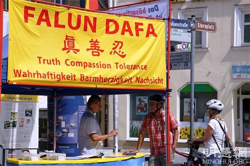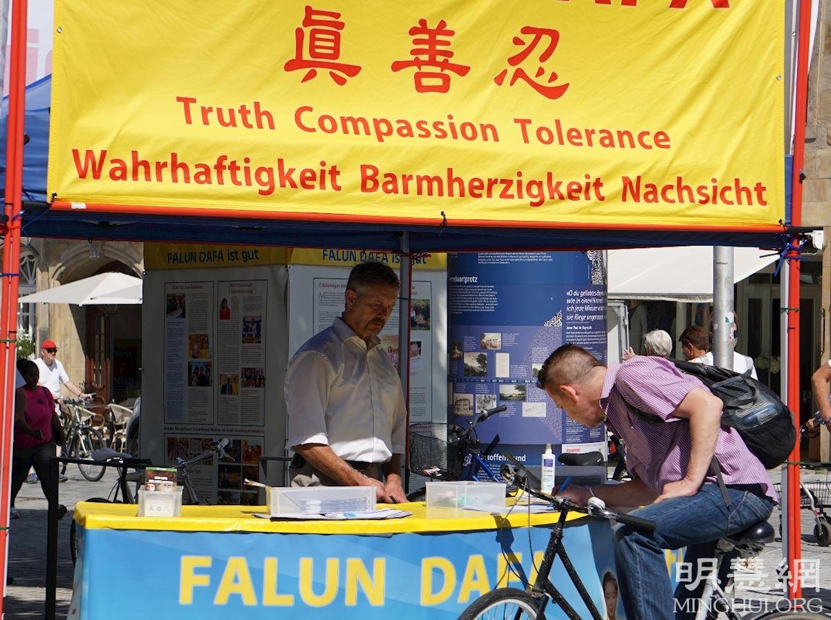 一对年轻人先是在展板前站立很久,阅读资料,后来到展位又向学员询问为什么中共要迫害这些好人,他们希望能签字支持法轮功。男青年表示自己住在拜罗伊特,经常看到一位学员(他手指向一位参加活动的法轮功学员)在市中心的卡尔商店前散发传单,“他几乎天天在那里,我当时不知道他在做什么,今天我终于知道了。我们可以再拿一份空白征签表吗?我们会在朋友中征签,等填满了我就交给那个法轮功学员,我知道去哪里能找到他!”