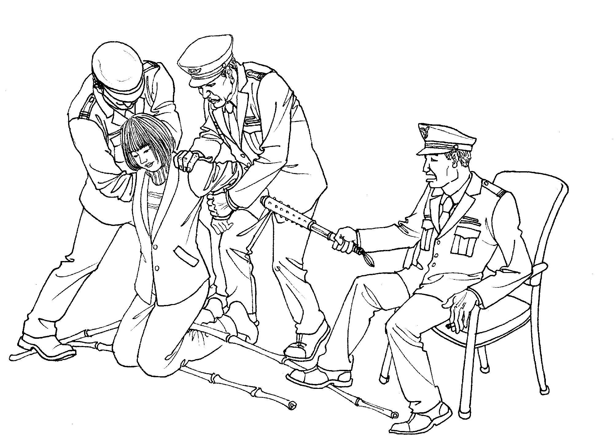 ![]() 中共酷刑示意图:背铐、电击、棒打、踩踢 |
