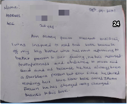 我,卡图巴,受到我哥哥的启发来读这本书,因为他想让我提升自己的生活方式。我曾经在家庭和社区中恶名昭彰,是个和耻辱相连的人。可是现在如果有人愿意赞助,我甚至想要重返学校去读书。这本书真的让我改变了。