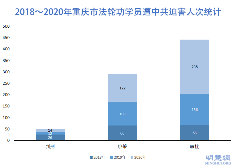 ![]() 图1:2018~2020年重庆市法轮功学员遭中共迫害人次统计 |