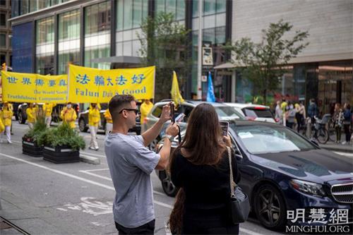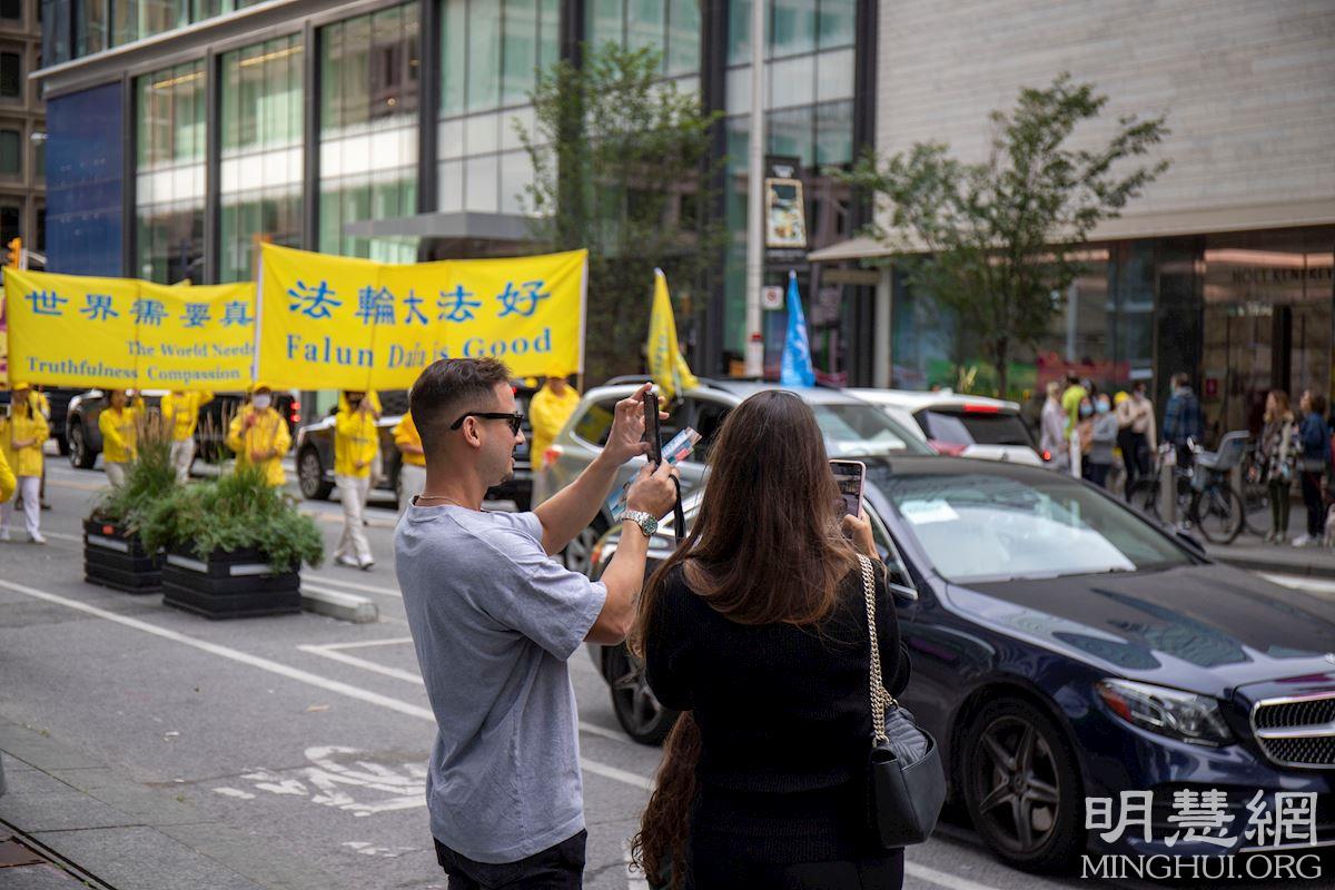 二零二一年九月二十五日是第三次大游行,沿途民众很多都照相和录像。有民众对法轮功的功法表示感兴趣,表示要全家都修炼法轮功;有民众表示要帮助法轮功反迫害;有民众表示要让更多人知道真相。