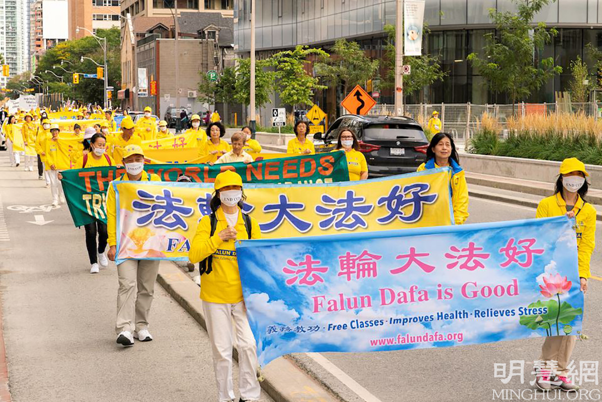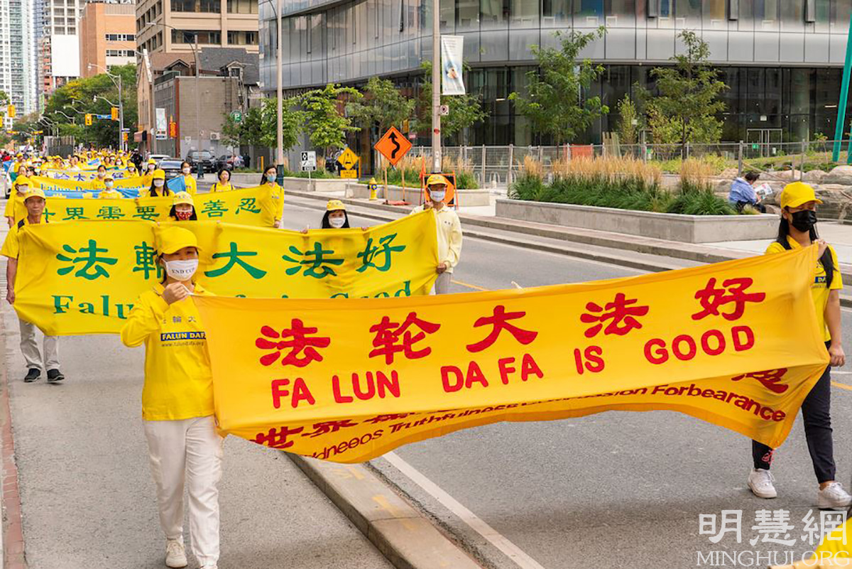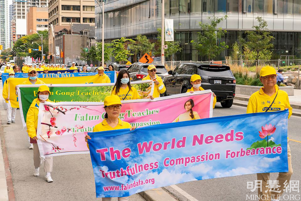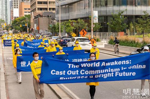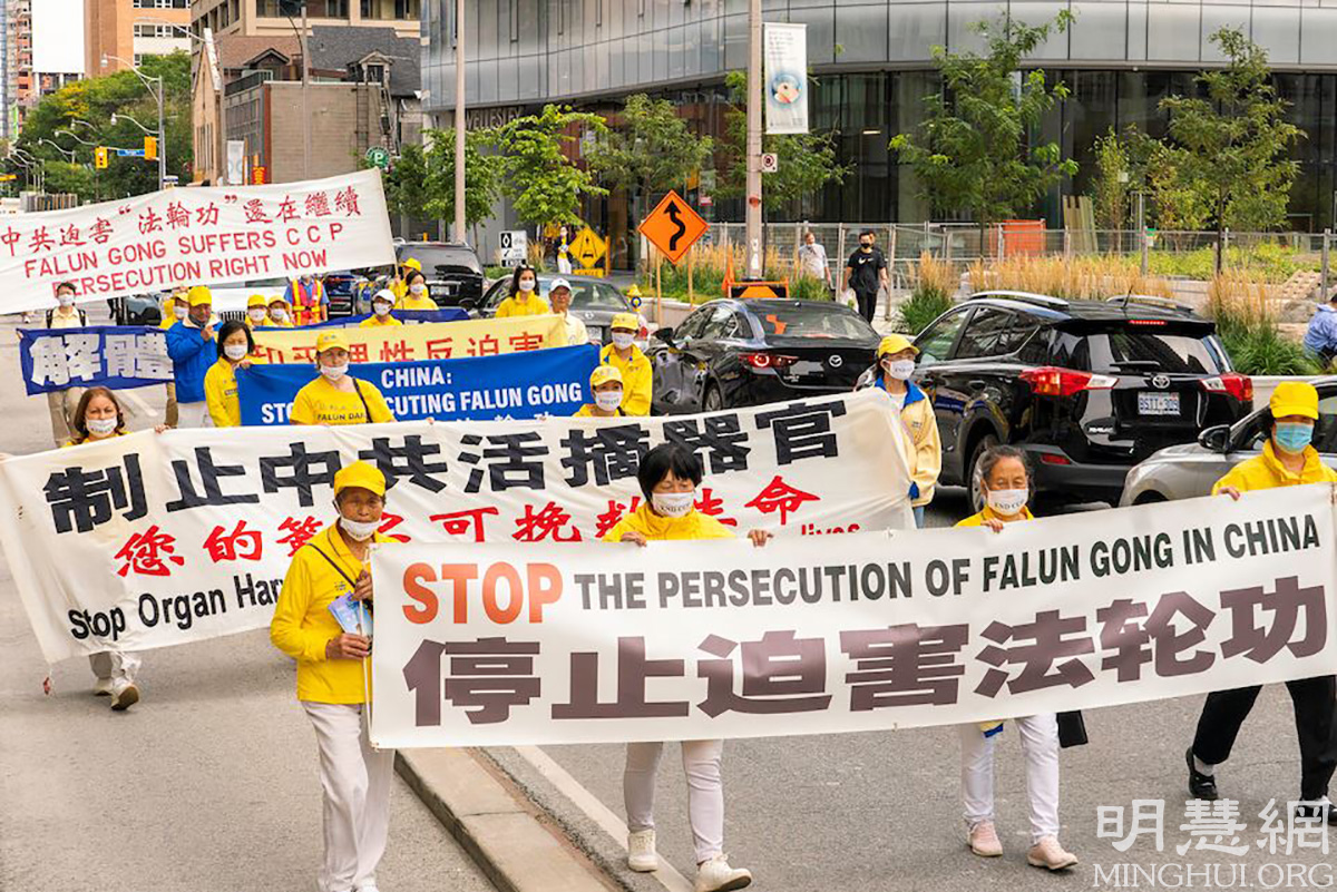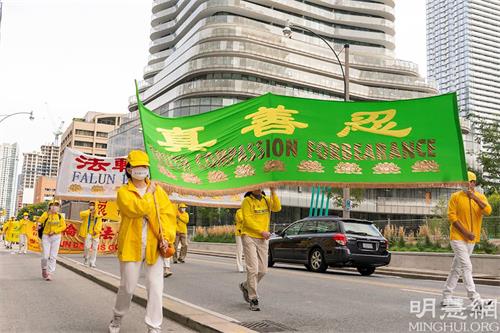【明慧网二零二一年九月二十七日】(明慧多伦多记者站报道)在疫情继续蔓延全世界的当今,为了让更多民众知道在疫情期间能保平安的秘诀和方法,让更多有缘民众了解法轮功和能从中受益,从今年的七月开始,加拿大多伦多的法轮功学员就决定了每月举行一次主题为“弘扬法轮大法 抛弃中共保平安”的游行。