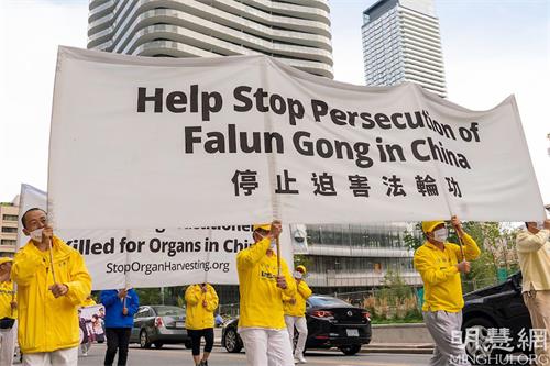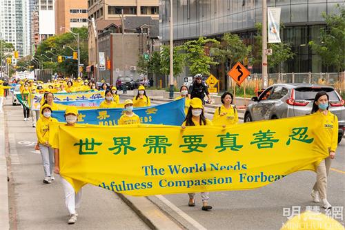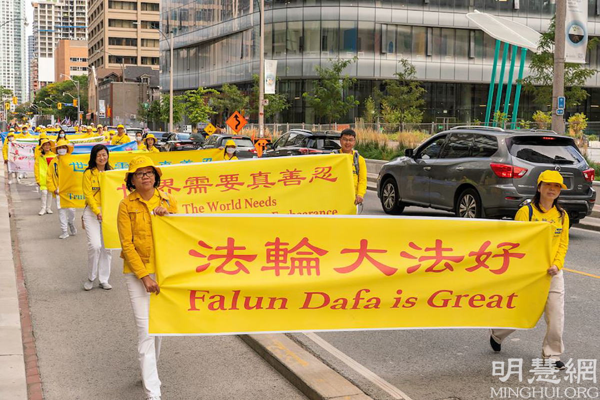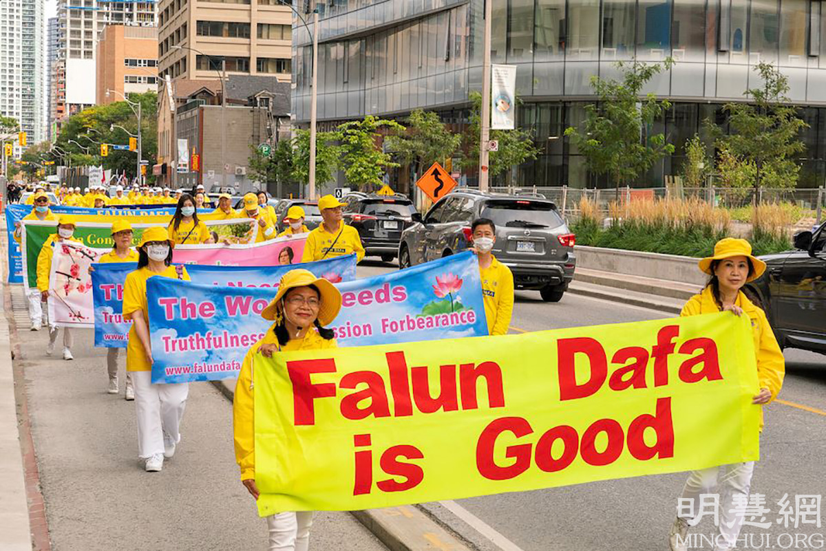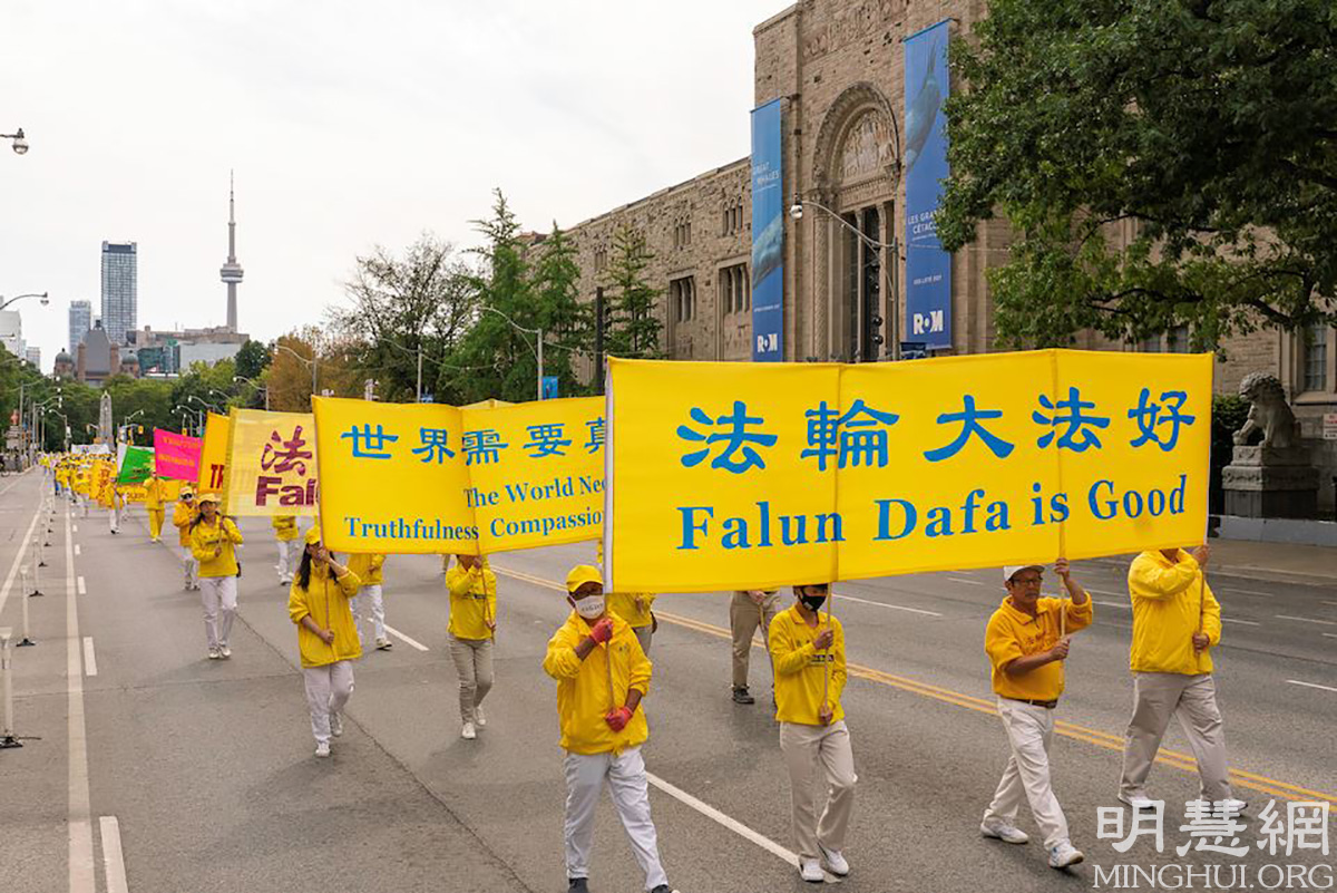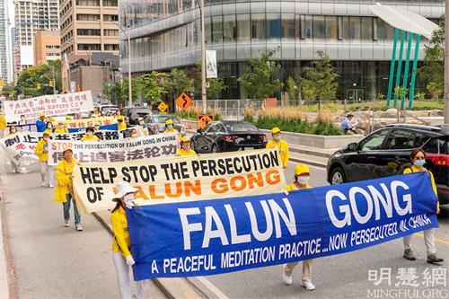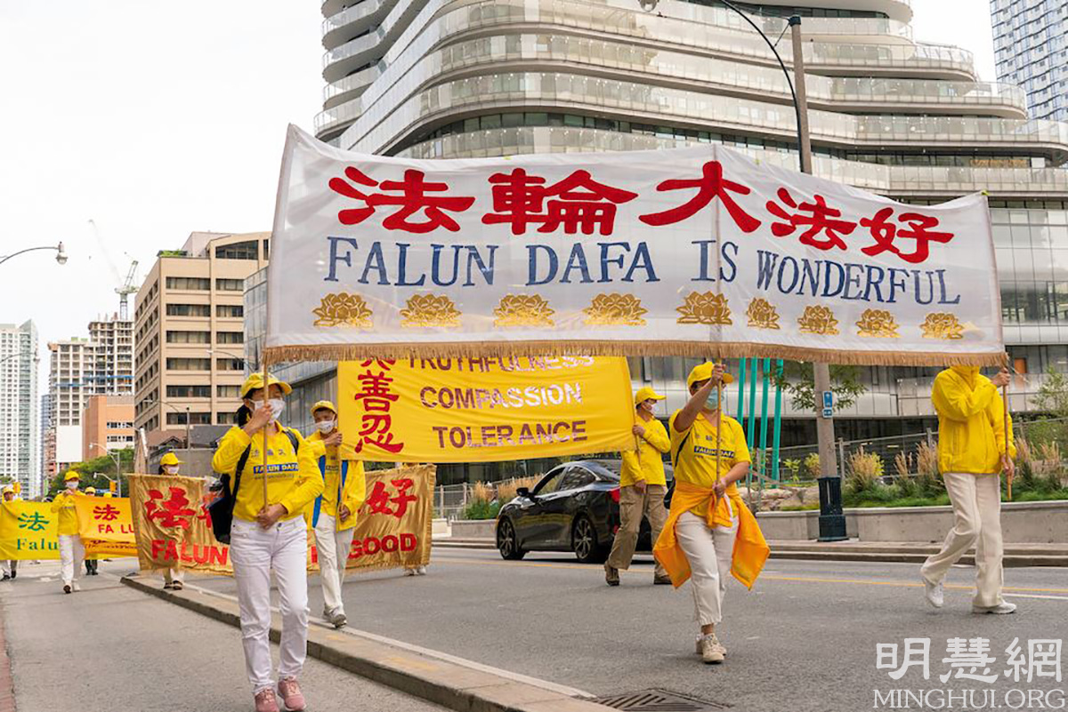 【明慧网二零二一年九月二十七日】(明慧多伦多记者站报道)在疫情继续蔓延全世界的当今,为了让更多民众知道在疫情期间能保平安的秘诀和方法,让更多有缘民众了解法轮功和能从中受益,从今年的七月开始,加拿大多伦多的法轮功学员就决定了每月举行一次主题为“弘扬法轮大法 抛弃中共保平安”的游行。