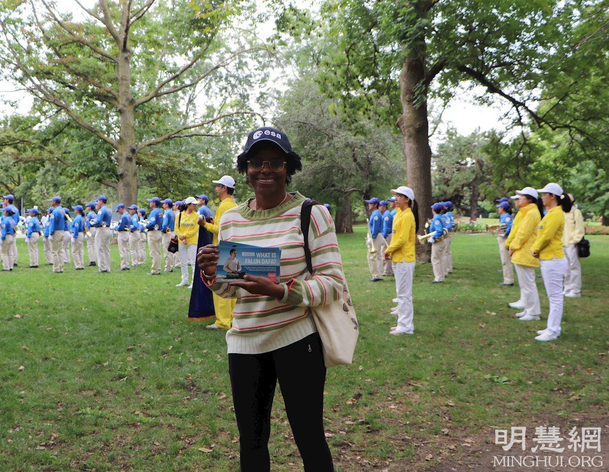 游行结束后,她写了短信给法轮功学员李女士:我很高兴我能够帮助并希望提高对法轮功修炼的认识。最后当她知道皇后公园是个炼功点时,她拿到时间安排表后高兴的表示她一定会来这个炼功点。