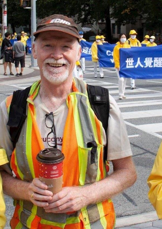 多伦多居民约翰(John)先生从中途跟着游行队伍一直走了終点,一路在和法轮功学员攀谈,约翰先生表示自己十几年前就知道法轮功,在不同的地方看到过法轮功学员举行的活动,并十分认同法轮功学员所提倡的真、善、忍价值观。