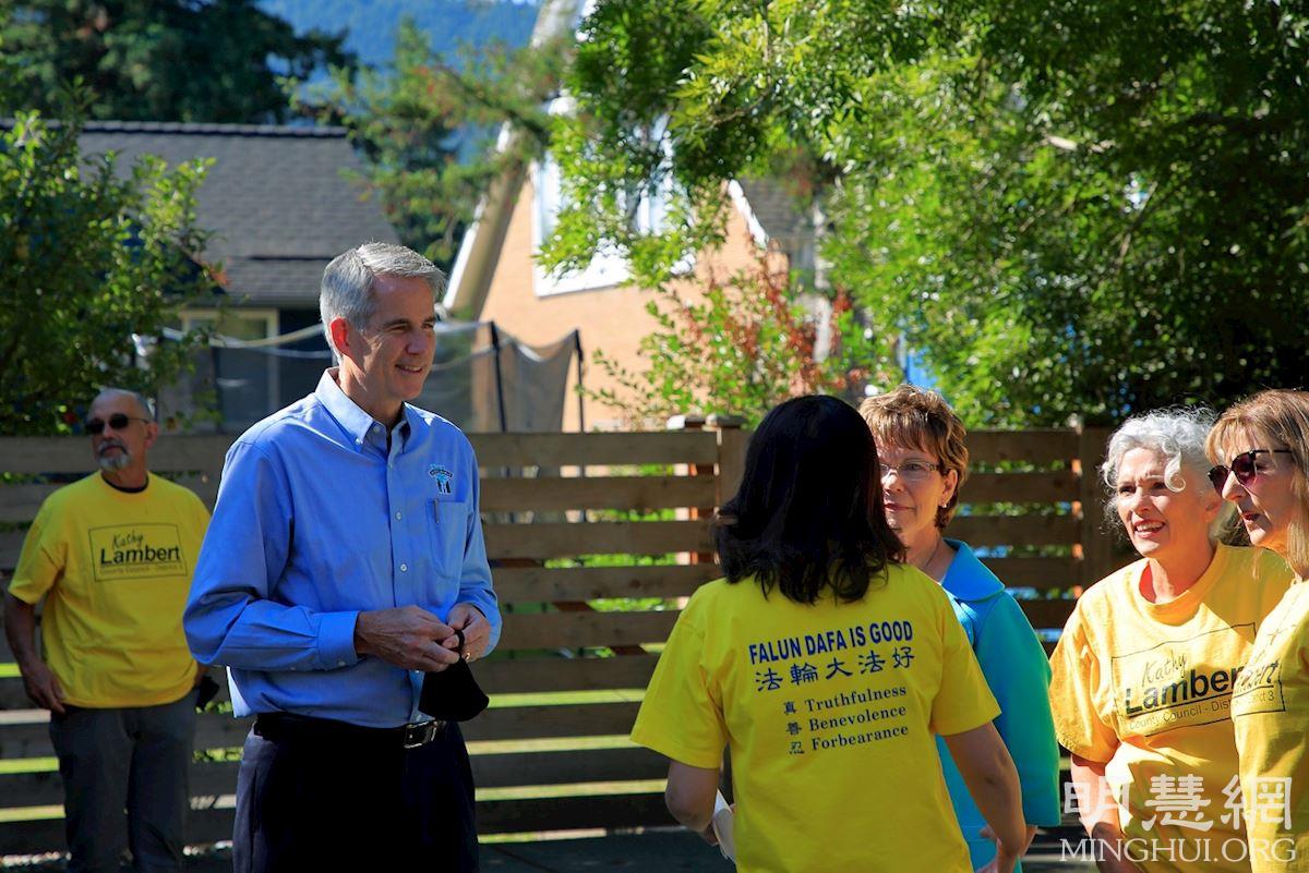 游行开始前,该市市长麦特·拉森市长,和华州国王县议员凯西·兰巴特女士来到了法轮功游行队伍前,与学员们合影留念。学员们向他们进一步讲述了法轮功真相。兰巴特女士曾经访问中国,在一次经历中她提醒陪从的中国人员要珍惜人的生命,她对学员讲述的中共对法轮功的迫害情况一点也不惊异,她表示自己知道中共的行径。