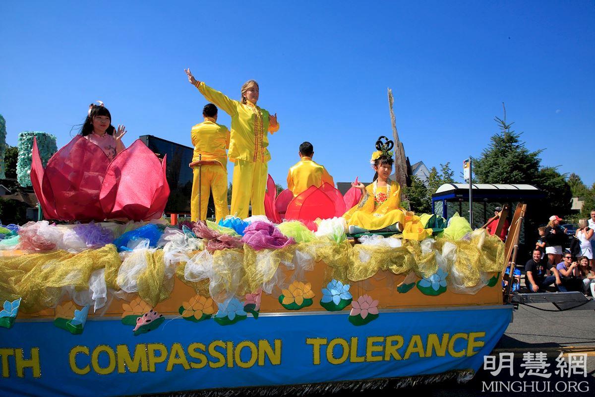 法轮功队伍进入游行路线,人群中纷纷表示“太美了”、“谢谢你们的光临!”“你们的花车最棒了!”法轮功学员在花车上示范动功和静功。花车上身着传统服饰的两位越南大法弟子和一位少年大法弟子向人群致意。腰鼓队的学员们随着法轮大法好和喜庆的音乐表演中国传统的腰鼓与大鼓,他们的鼓声增添了这座城市的喜庆气氛。人们为法轮功的队伍热烈鼓掌。
