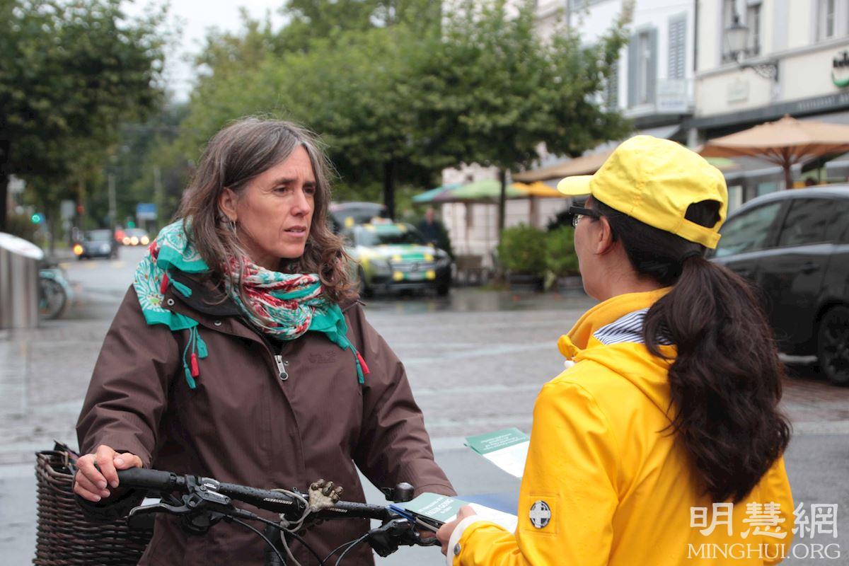 二零二一年八月二十八日,理疗师克丽丝塔(Christa Krapf Fofana)在温特图尔市内的格拉本广场(Grabenplatz)看到法轮功学员的功法演示,她觉得很祥和,停下了自行车,跟学员攀谈。当了解到中共的迫害后,她表示:“人们应该为此(制止迫害)发声。”