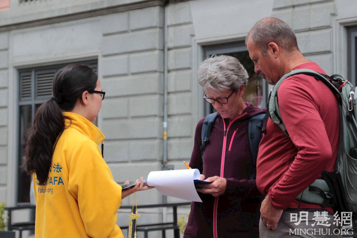 年轻女孩米莲姆(Mirjam Bouchama)是一位幼教,她和在报社工作的朋友兰妮(Leanie Gerig)都是第一次听说法轮功。她说看着学员的炼功演示,“让人心安,他们是如此的平静、专注。”她们无法理解为什么中共要迫害法轮功,说:“(法轮功学员)只是锻炼,让自己的身体变好,却遭到迫害。这让我无法理解,太邪恶了。迫害无论如何应该结束了。”她们都在呼吁制止迫害的征签表上签了名。