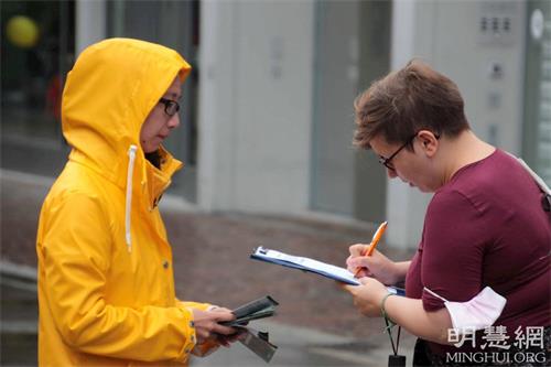 虽然当天曾大雨倾盆,但是法轮功学员的功法演示,为反迫害征集签名还是让不少路人驻足观看,与学员交谈。有的直接到信息摊位前签名支持法轮功,有的则向学员询问如何开始修炼法轮功,还有的自己签名后又带着朋友来签名。