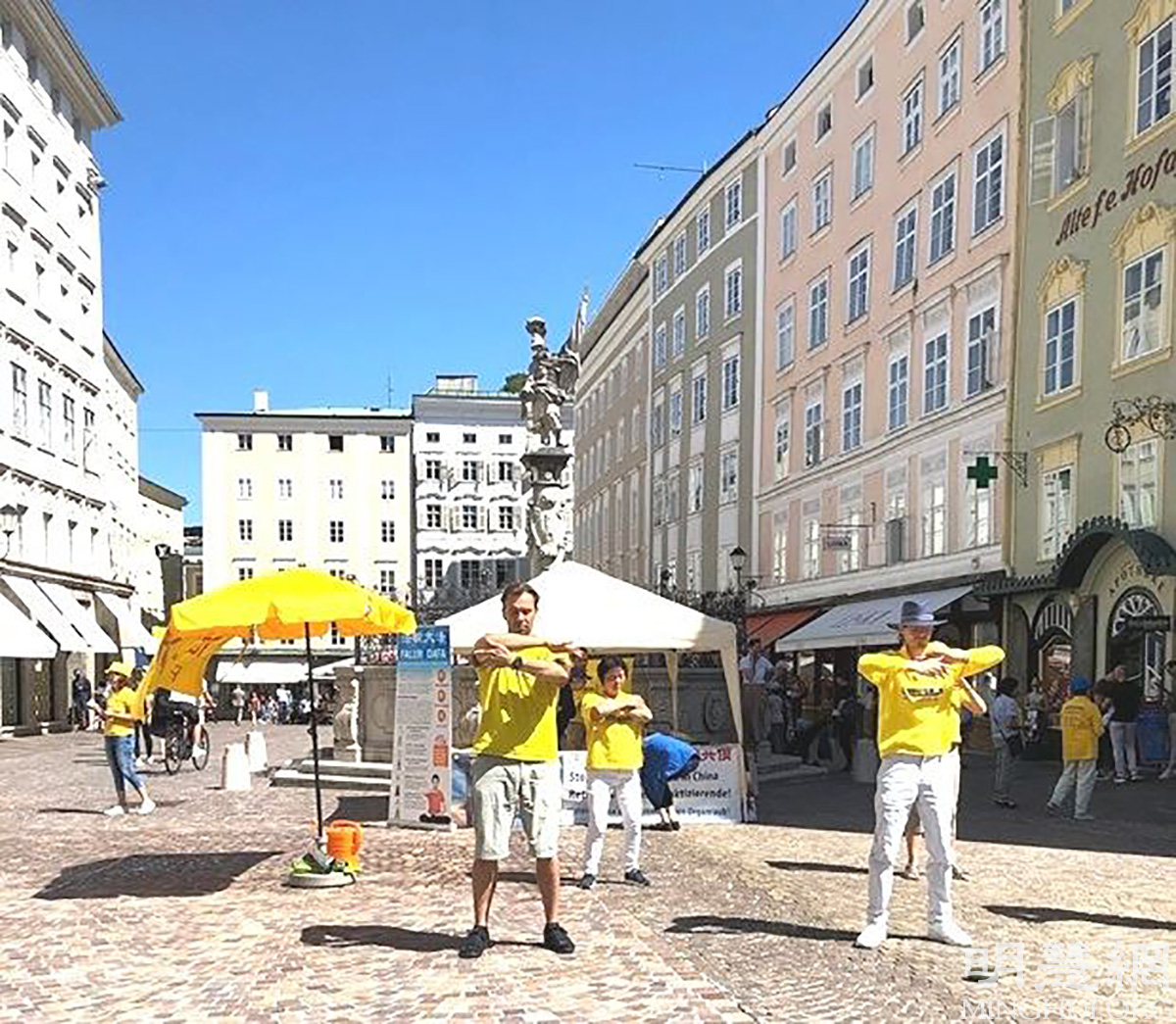 二零二一年八月七日,法轮功学员聚集在萨尔兹堡老城区,通过五套功法的展示和真相资料,告诉世人大法的美好以及法轮功学员在中国遭受的残酷迫害,甚至被活摘器官。