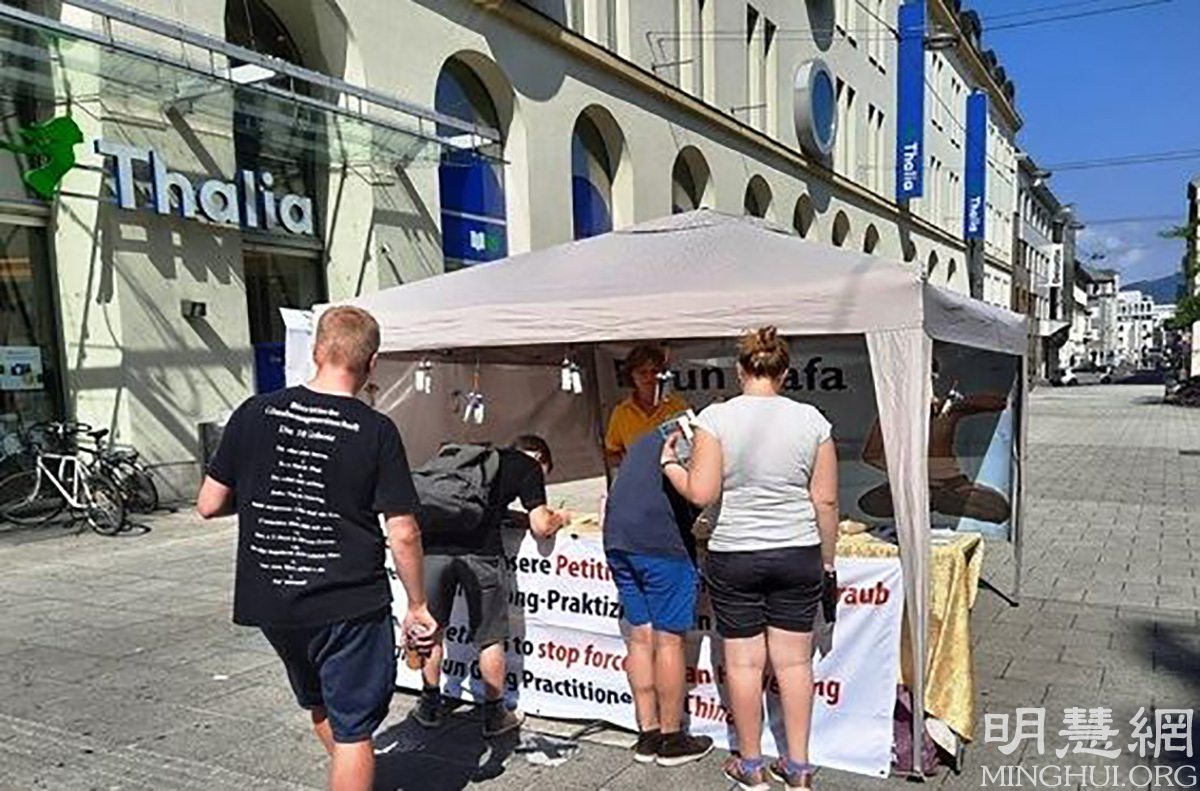 在接下来的周末,二零二一年八月十四日,法轮功学员在奥地利第三大城市林茨举办了真相日活动。真相展台前醒目的揭露中共活摘器官的横幅,吸引了很多民众前来签名反迫害。