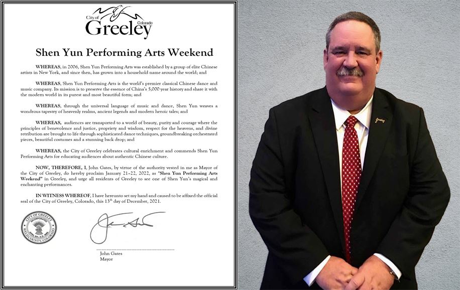 二零二二年一月二十一日和二十二日,神韵纽约艺术团莅临美国科罗拉多州格里利蒙福特音乐厅上演二场演出。演出前,该市市长约翰·盖茨(John Gates)颁发褒奖欢迎神韵到来,鼓励所有市民前往观赏神韵演出。