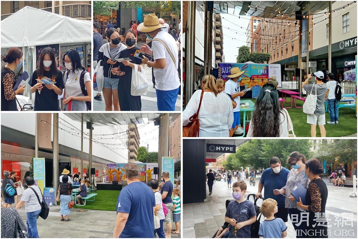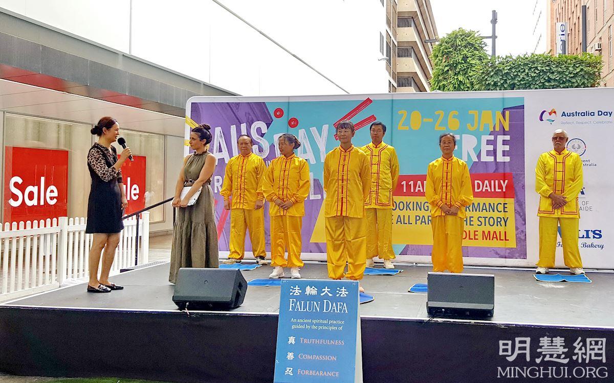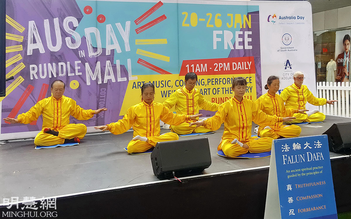 二零二二年一月二十四日中午,法轮功学员受邀在兰道商业步行街(Rundle Mall)商业中心露天舞台进行功法展示。兰道商业步行街是阿德莱德最繁华的旅游观光购物区。主办方主持人和法轮功学员代表梅女士(Sveta Mei)一起,介绍法轮功,接着六位身着中国传统风格炼功服的法轮功学员在优美殊胜的炼功音乐中展示五套功法。过往人们三三两两驻足观看,有的接过法轮功真相传单,很多人拍照录像,一位西人还全程录下功法展示。也有一些华人拍照和听学员介绍法轮功。明白真相的民众纷纷签名谴责中共迫害法轮功。