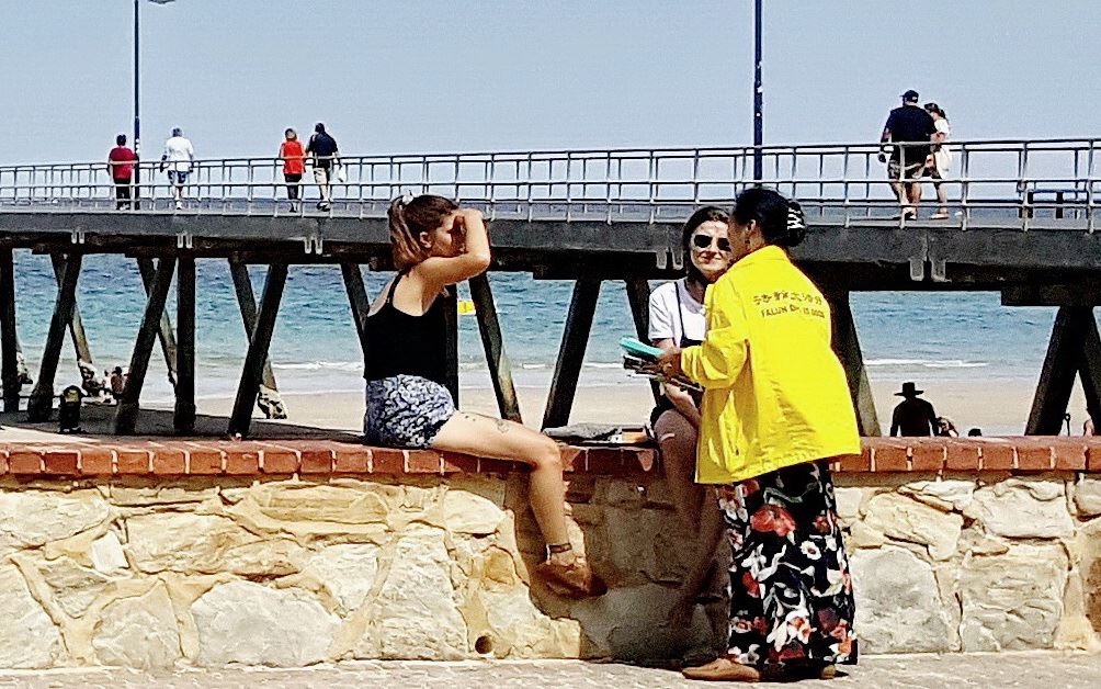 面对瘟疫,许多澳洲民众选择到海滩休息和锻炼。近期部份法轮功学员在格莱内尔格海滩(Glenelg Beach)展示法轮功功法并举行汽车游行,受到市民的欢迎和支持。