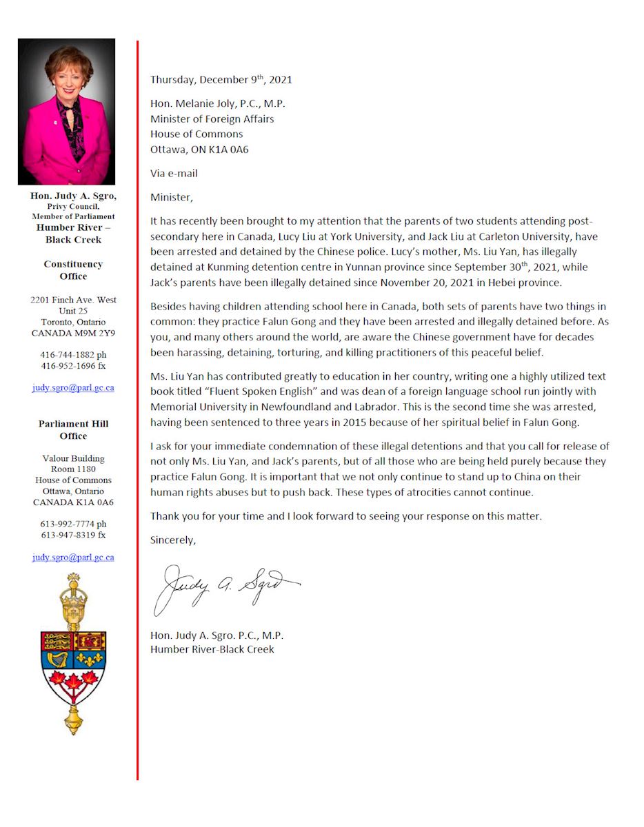 ![]() 图1:加拿大国会法轮功之友联合主席,国会议员斯格若(Judy Sgro)二零二一年十二月十日,向总理特鲁多发电子邮件,要求总理立即谴责中共对法轮功学员的非法拘禁,并要求释放加拿大人家属。 |