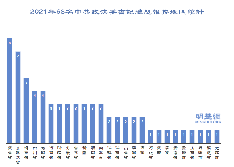 ![]() 图1:2021年68名中共政法委书记遭恶报按地区统计 |