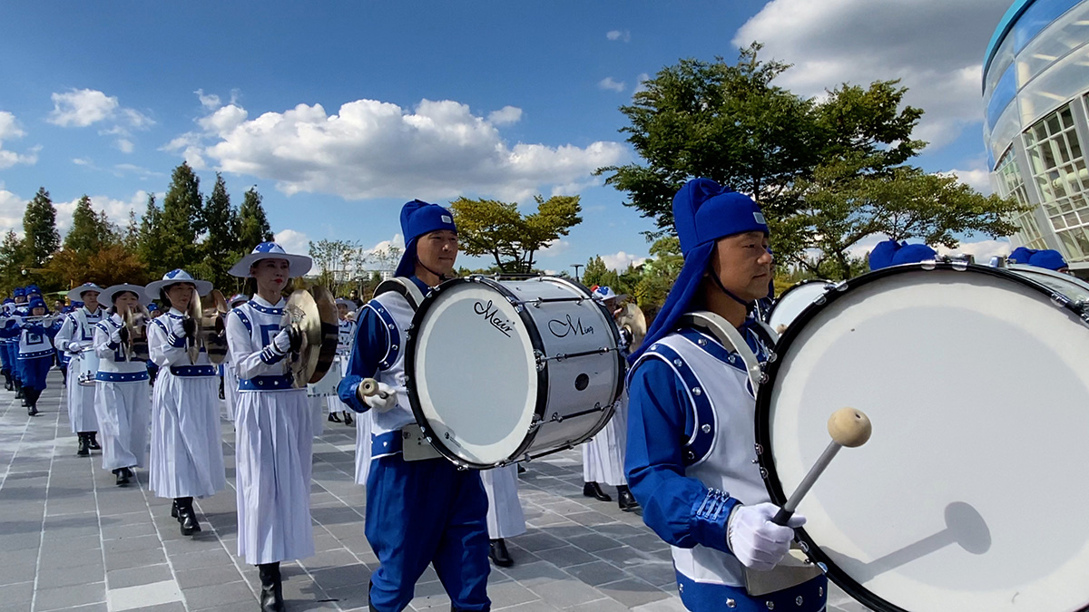 下午两点,庆典大游行拉开帷幕,天国乐团队伍由两位身穿金黄色服装的法轮功学员,举着“法轮大法”锦旗打头阵。天国乐团演奏了《法轮大法好》、《送宝》、《神圣的歌》等代表曲目。沿途观众纷纷为叫好、欢呼,并拿出手机为天国乐团拍照,录像。