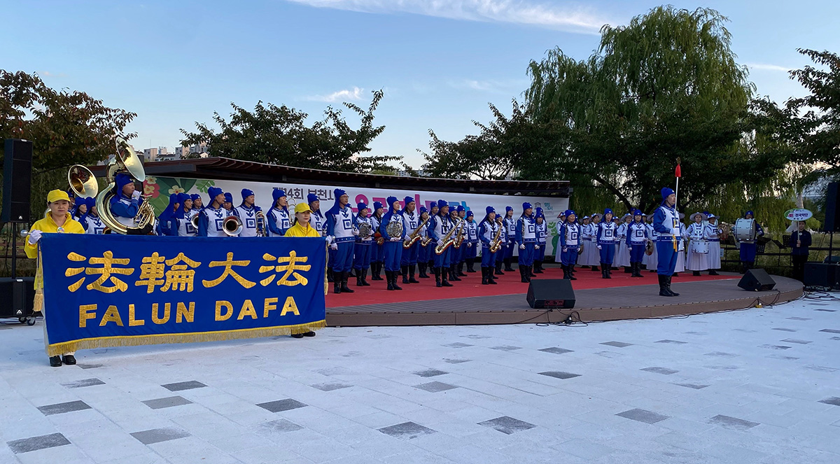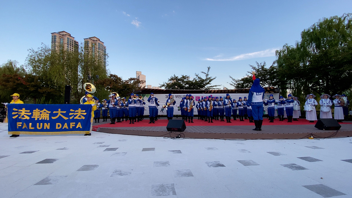 ![]() 图1~2:韩国法轮功学员组成的天国乐团参加二零二二年十月八日在富川市举行的第十四届“市民和睦庆典”大游行活动。 |