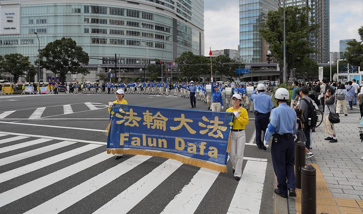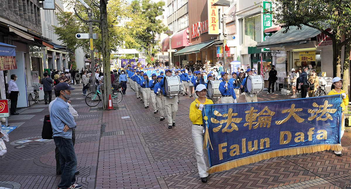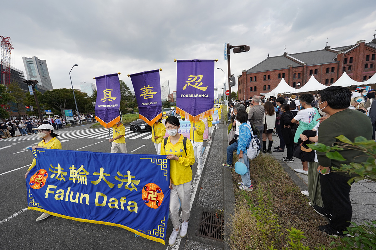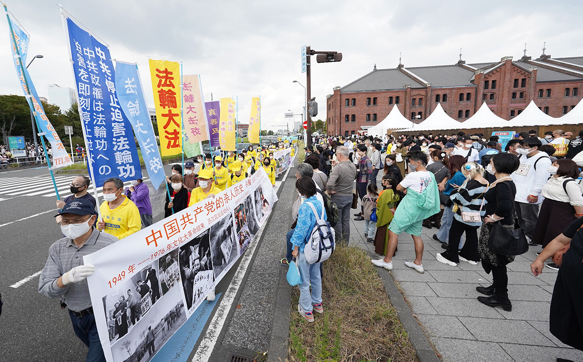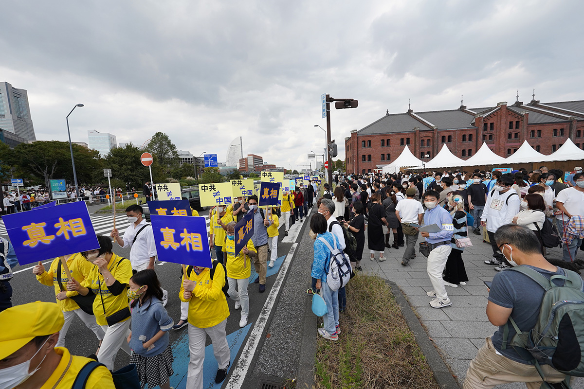 集会结束后,数百名法轮功学员手持“法轮大法好”、“法轮大法在日本”、“四亿中国人退出中共党团队组织”、“打倒中共恶魔”、“中共≠中国”等横幅游行。游行队伍由威武雄壮的天国乐团引领,英姿飒爽的腰鼓队压轴,途经横滨市中心、红砖仓库、中华街等多个旅游景点,引起民众的关注,人们纷纷了解真相。