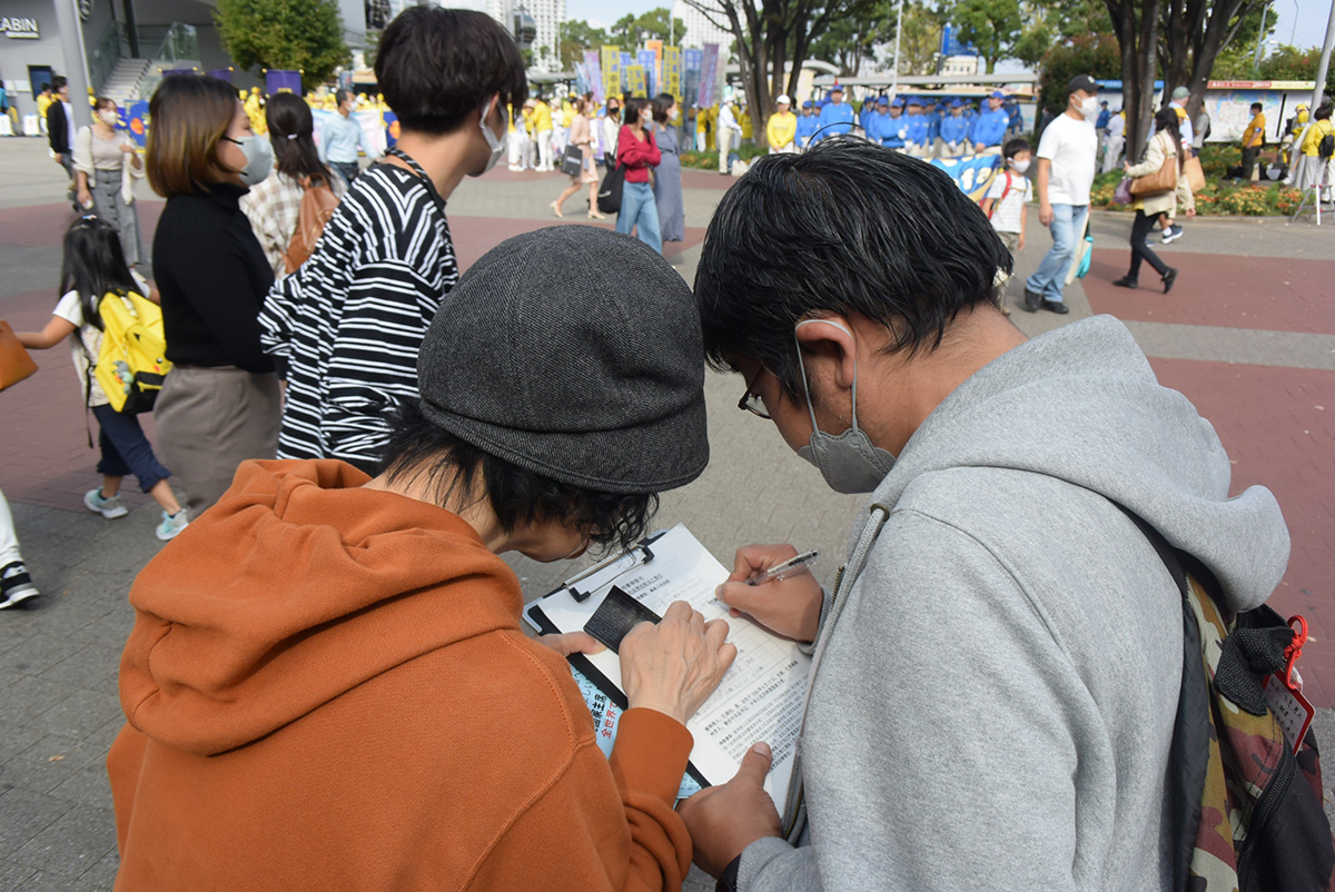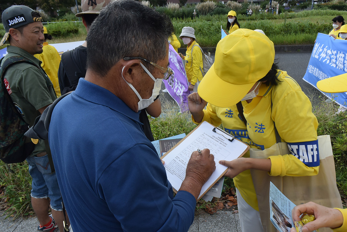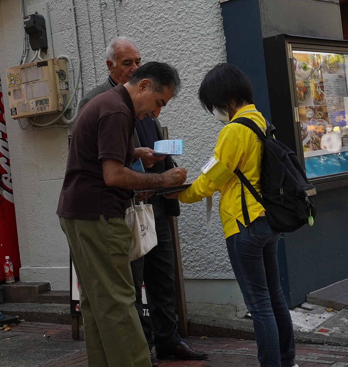 从岐阜県来横滨观光的岩田先生,听完法轮功被迫害的真相后说:“我当然不支持中共(政府),活摘人体器官的事不该发生。请你们加油。”