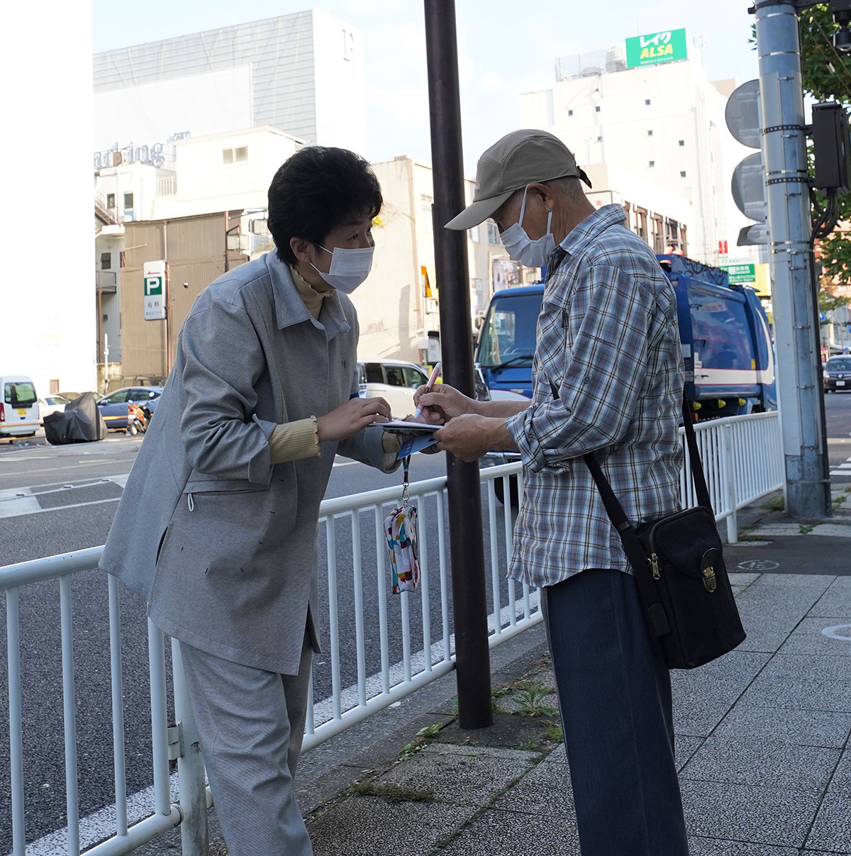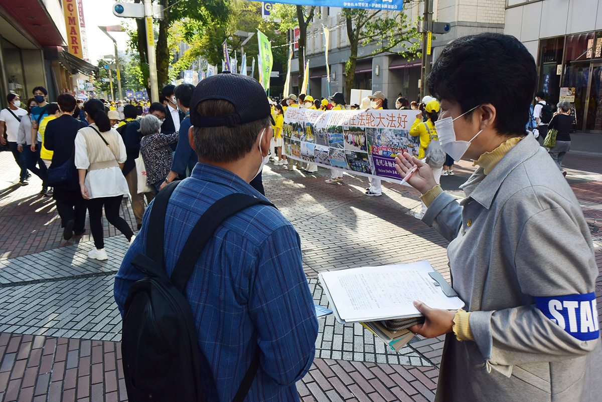 路过游行的出发地点樱木町前广场的高桥先生,听完中共迫害法轮功学员的真相后说:“我想还有很多日本人不知道迫害的事,请你们向更多的人传达,加油。”