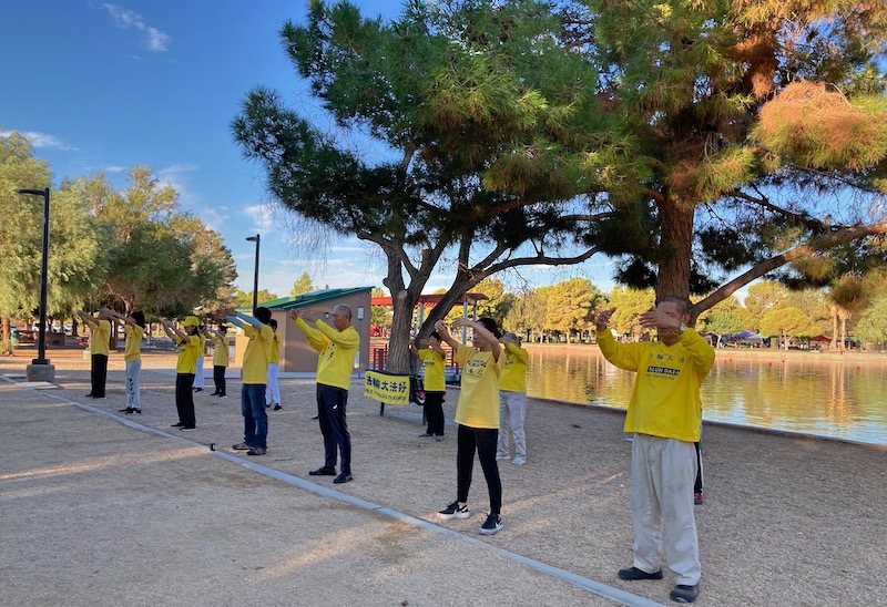 ![]() 图3:二零二二年九月十八日,美国拉斯维加斯部份法轮功学员在日落公园集体炼功、弘法。 |