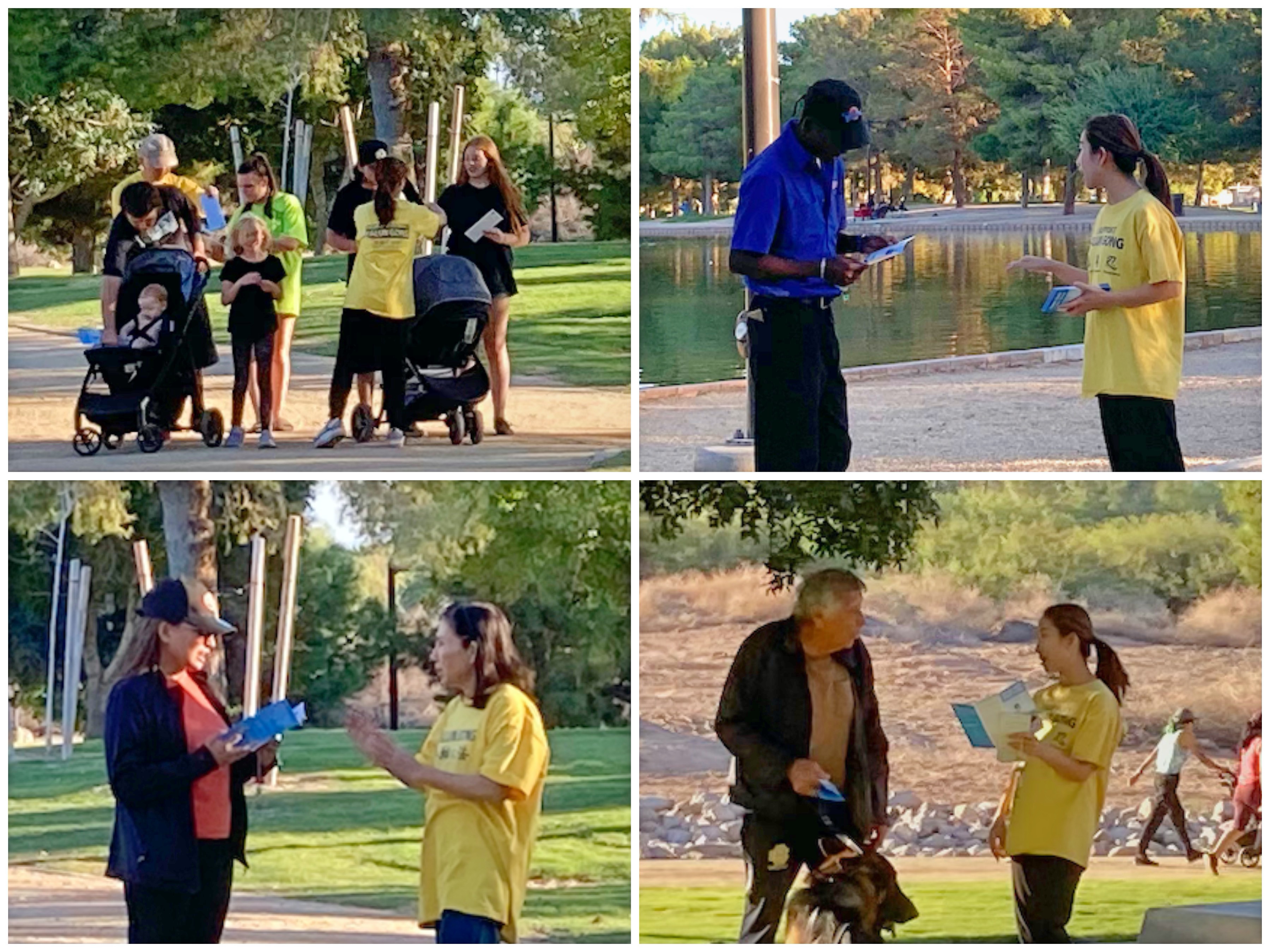 ![]() 图2:二零二二年九月十一日,美国拉斯维加斯部份法轮功学员在日落公园集体炼功、弘法,这两位古巴人经过时马上现场学炼法轮功。 |