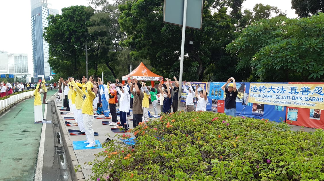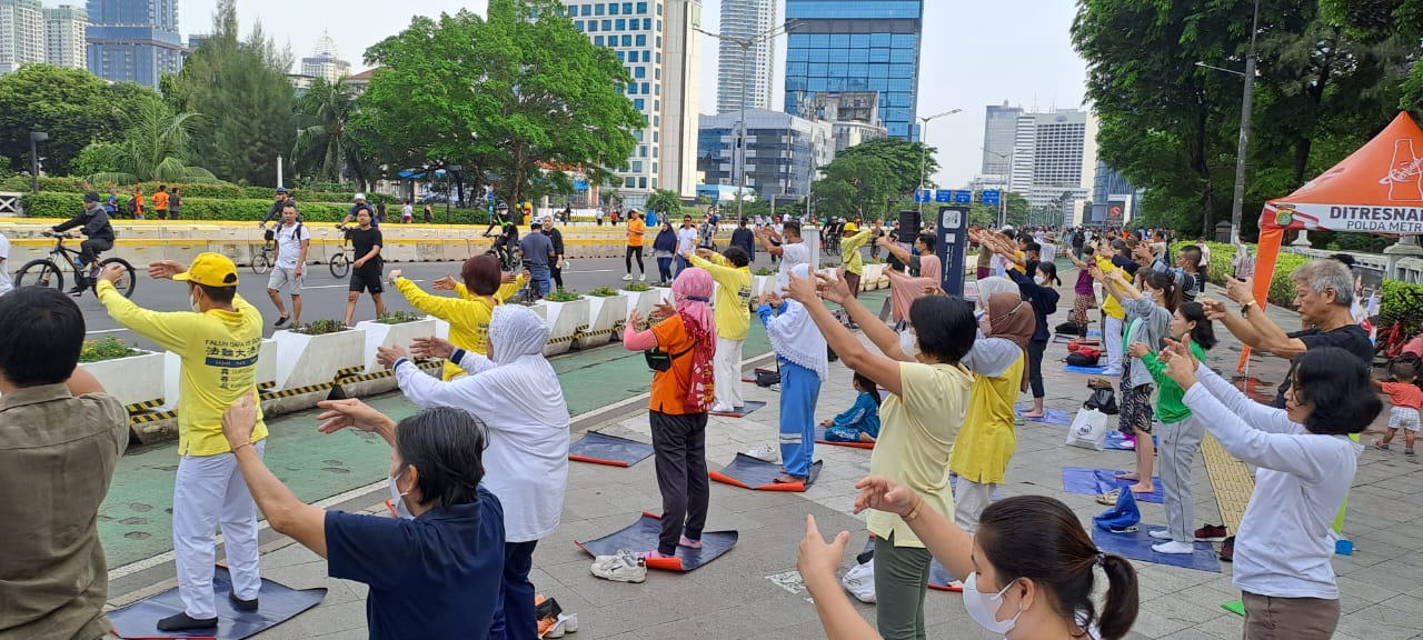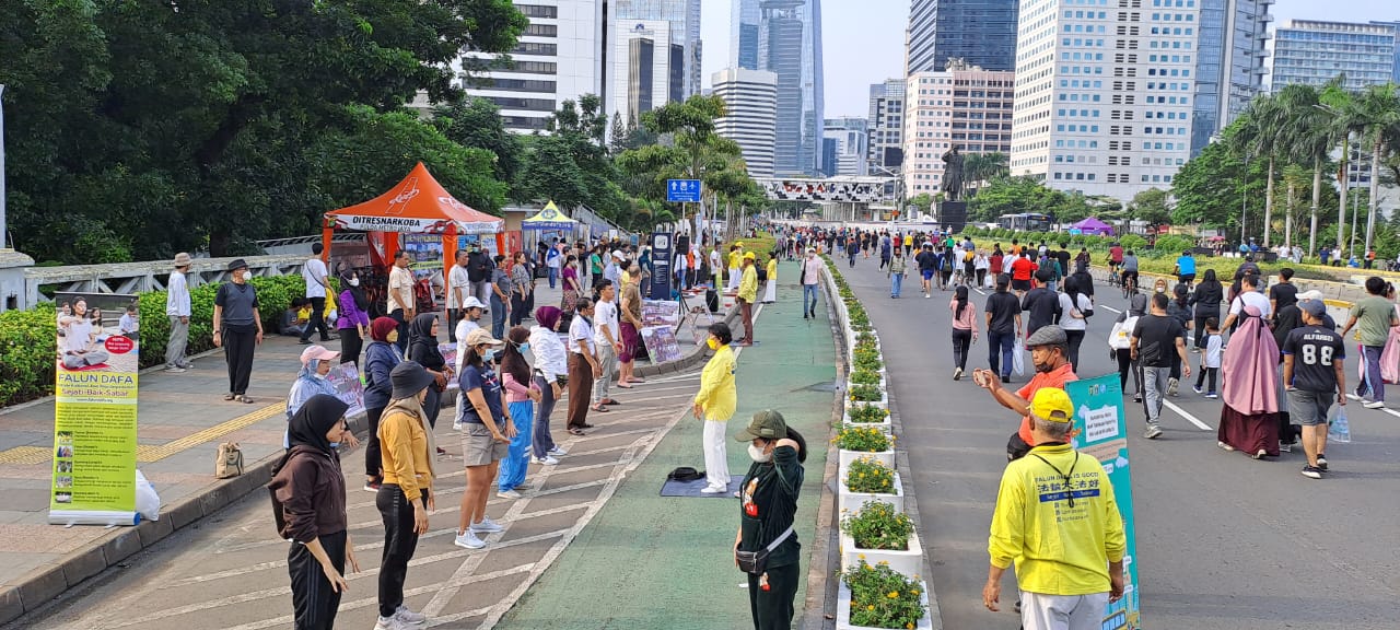 【明慧网二零二二年十月二十日】二零二二年十月十六日周日上午,部份印度尼西亚法轮功学员们,在雅加达(Jakarta)商业中心的几条无车日道路上举行弘法活动,并向正在晨练的雅加达民众介绍法轮大法。法轮功学员的功法展示,引起了民众的关注。