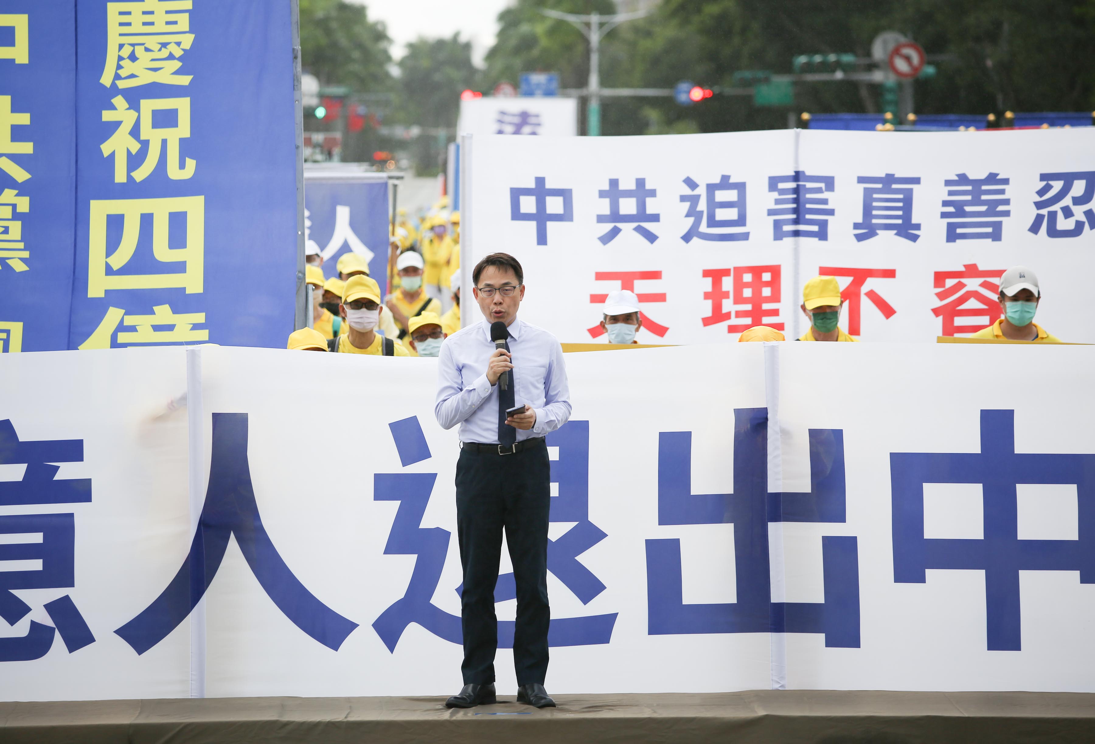 台北市议员江志铭致词表示,法轮功传到一百多个国家,学员在全世界讲述真相,过程中让更多人认识到中共的邪恶本质,让更多中国人选择退出中共,也让世界上越来越多人唾弃中共。台北今天举行庆祝四亿人三退的活动,让更多人知道消息、响应三退,让三退运动遍地开花,传到世界各国。