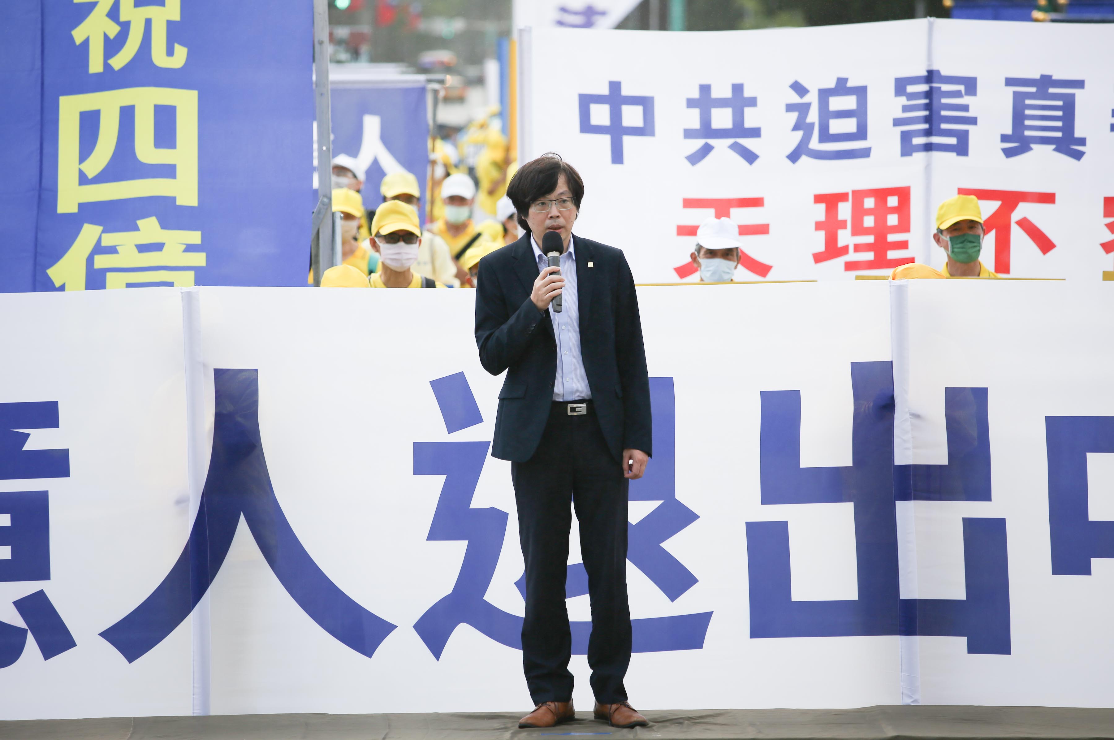 在集会中,台湾法轮大法学会理事长萧松山教授首先发言表示,江泽民集团发动迫害法轮功已经长达二十三年,中共至今仍在迫害学员,甚至活摘器官贩卖……然而由于中共严密监控媒体和网路,一般人很难得知这些事实。他呼吁中国民众“了解事实真相,不要被利用参与迫害法轮功”。
